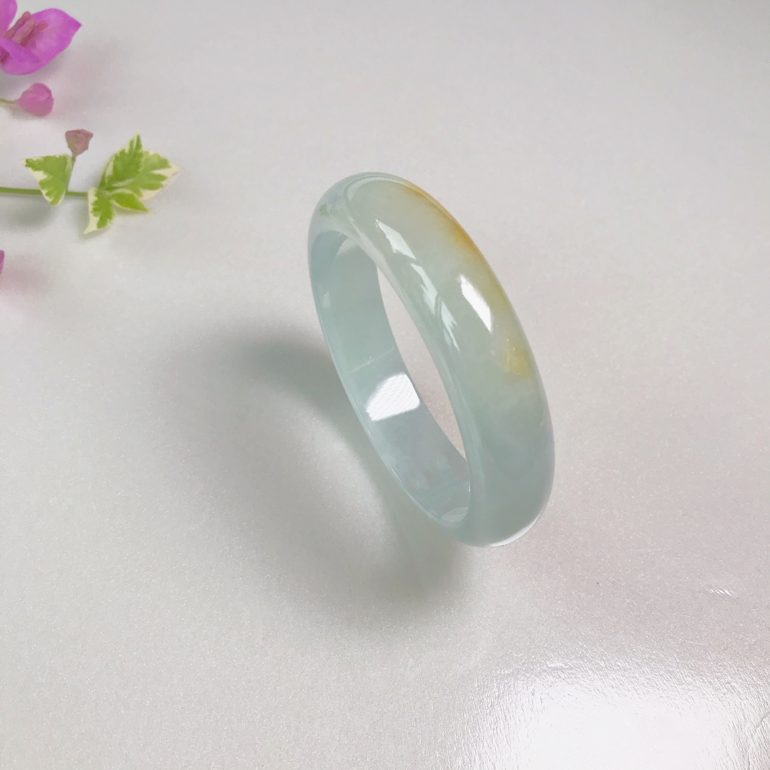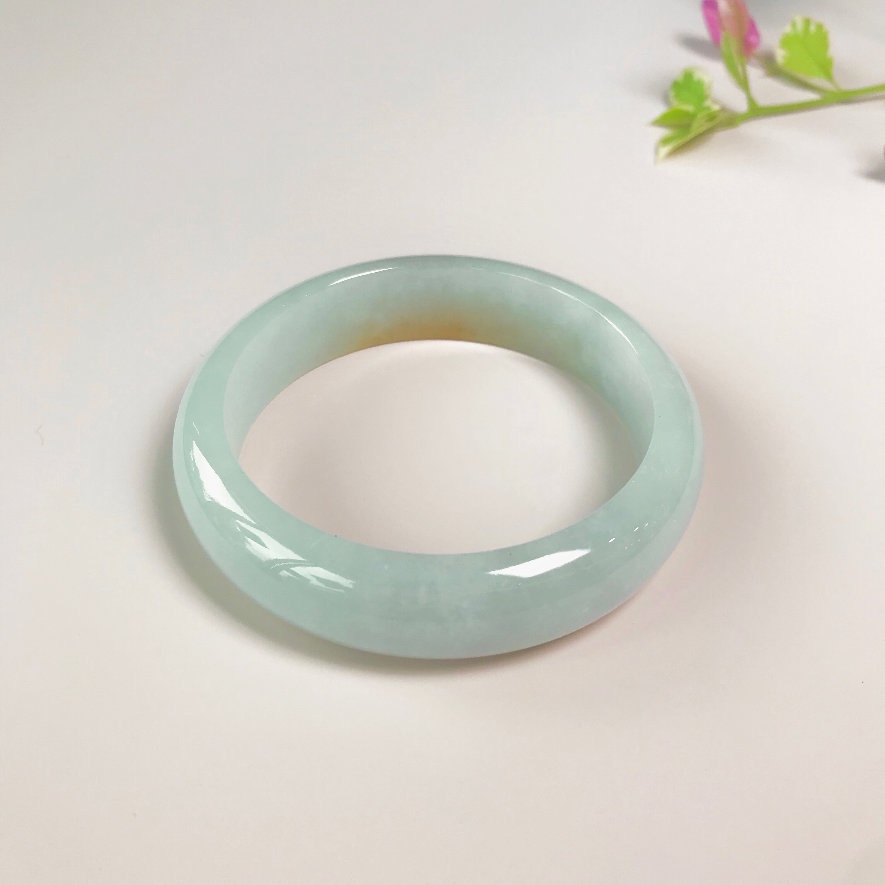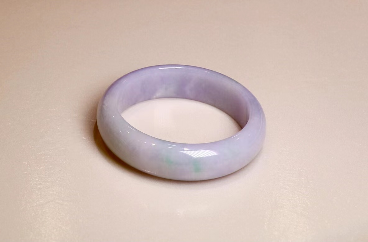 这件糯种翡翠平安镯:整体水润洁净,浅紫底飘淡绿,奇妙的是出现一黄翡点缀。