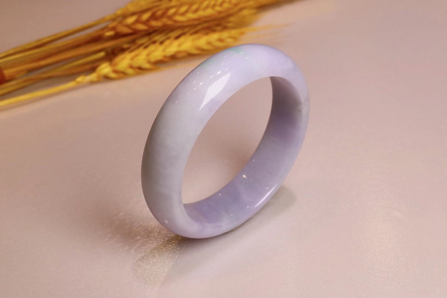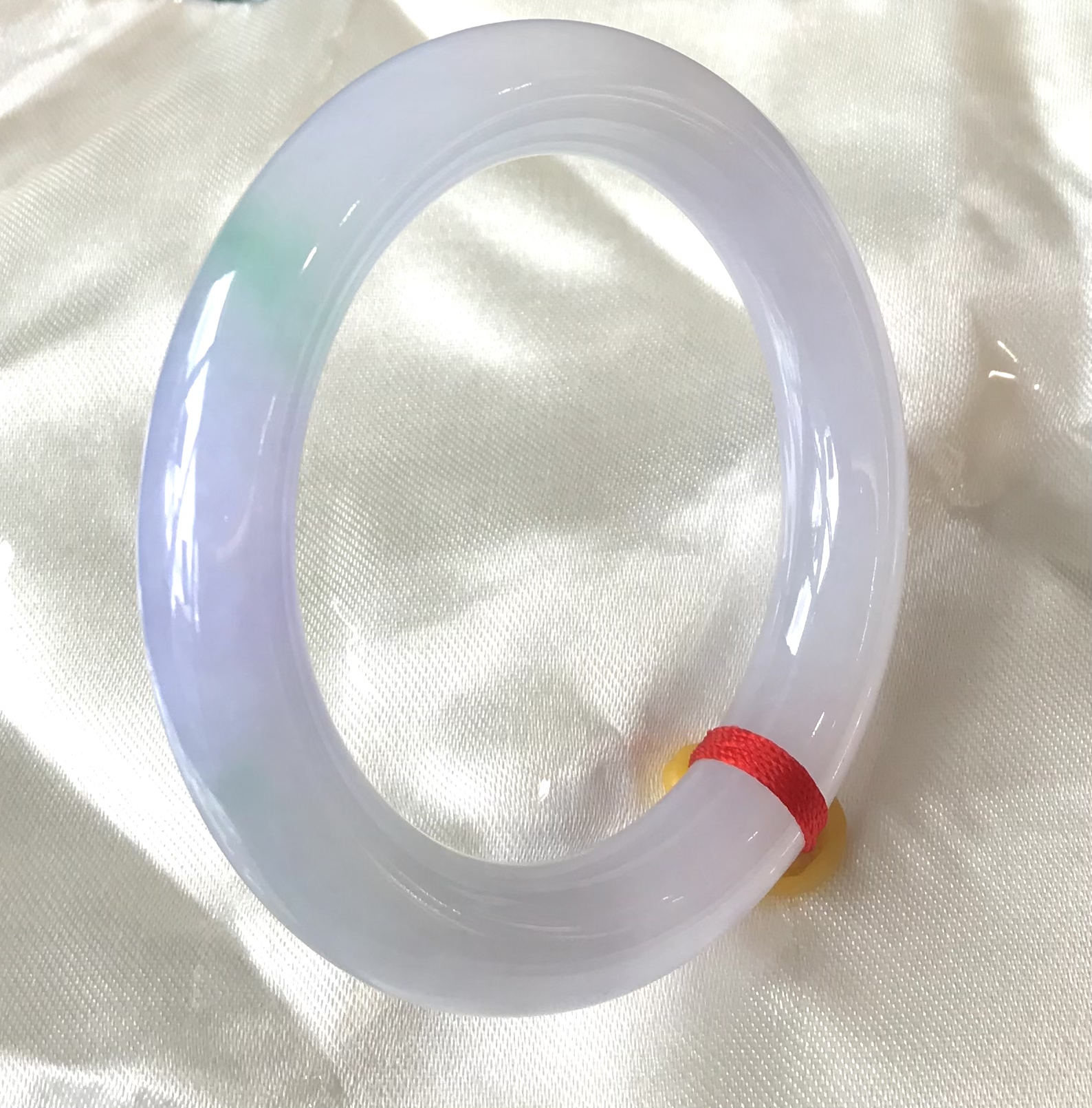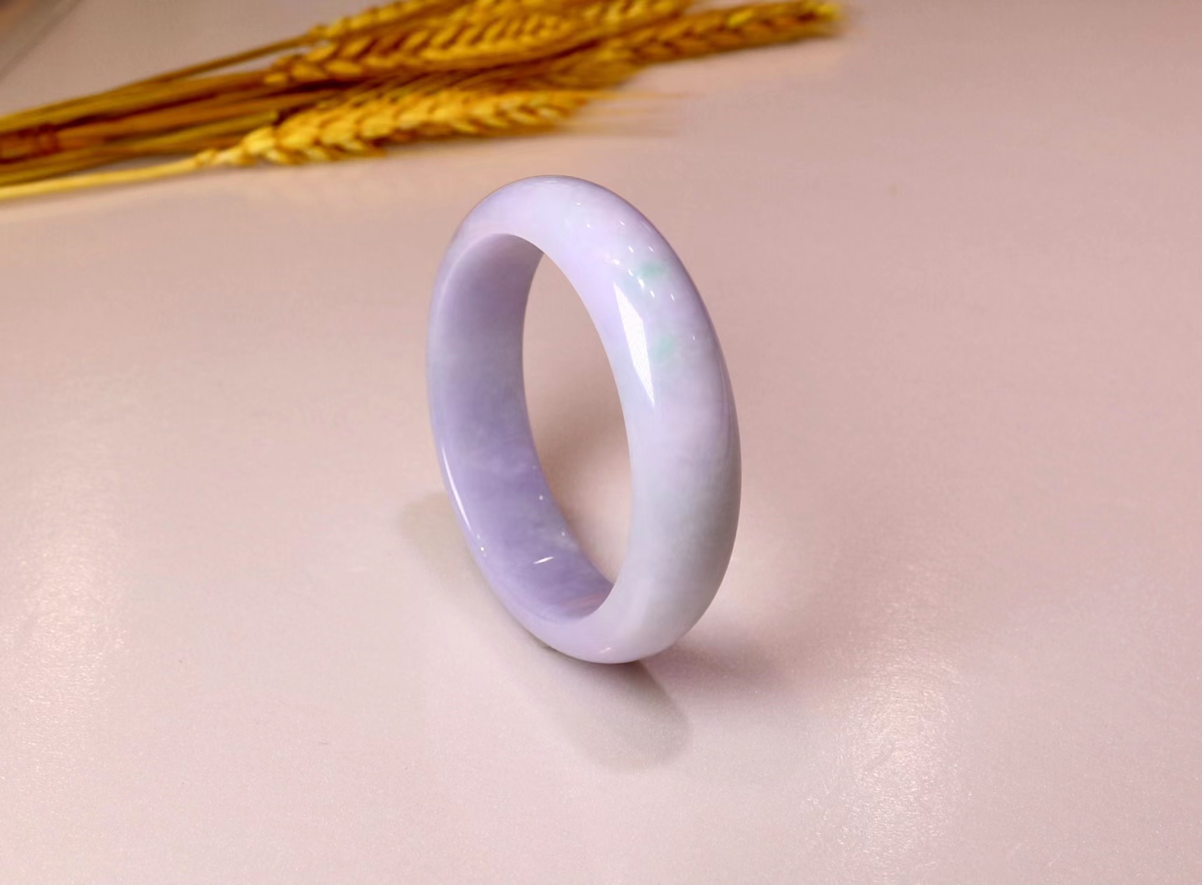 这件糯种翡翠平安镯:整体水润洁净,浅紫底飘淡绿,奇妙的是出现一黄翡点缀。