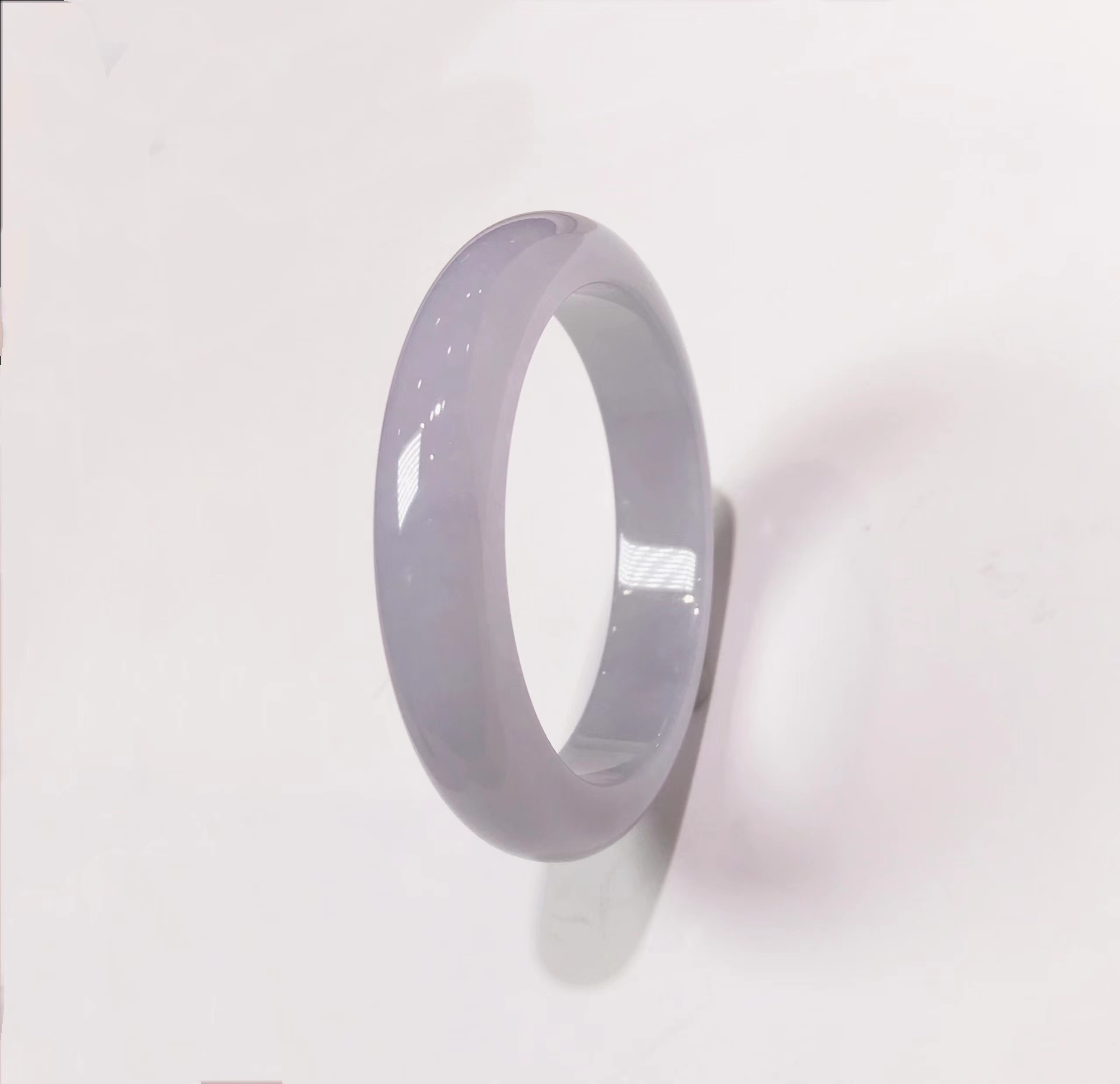 这条紫色手镯,非常难得的品质,条幅厚实,整体是均匀的半透明,淡淡的紫色和绿色相交替,清爽淡雅。佩戴上手,显得非常高贵大气。性价比高。