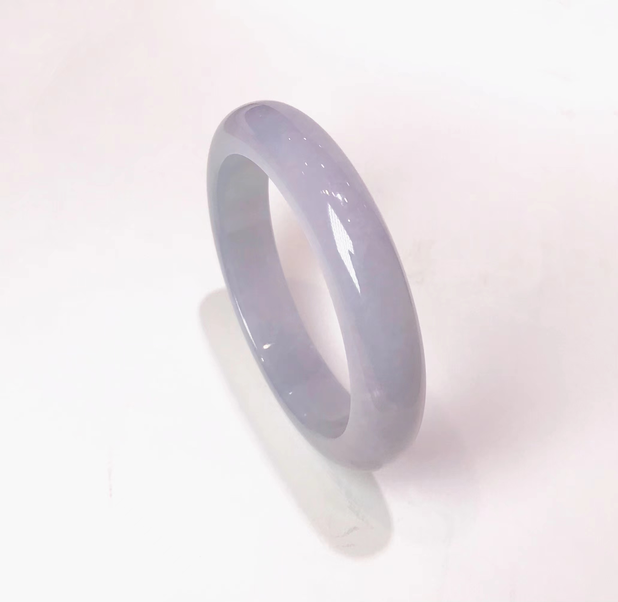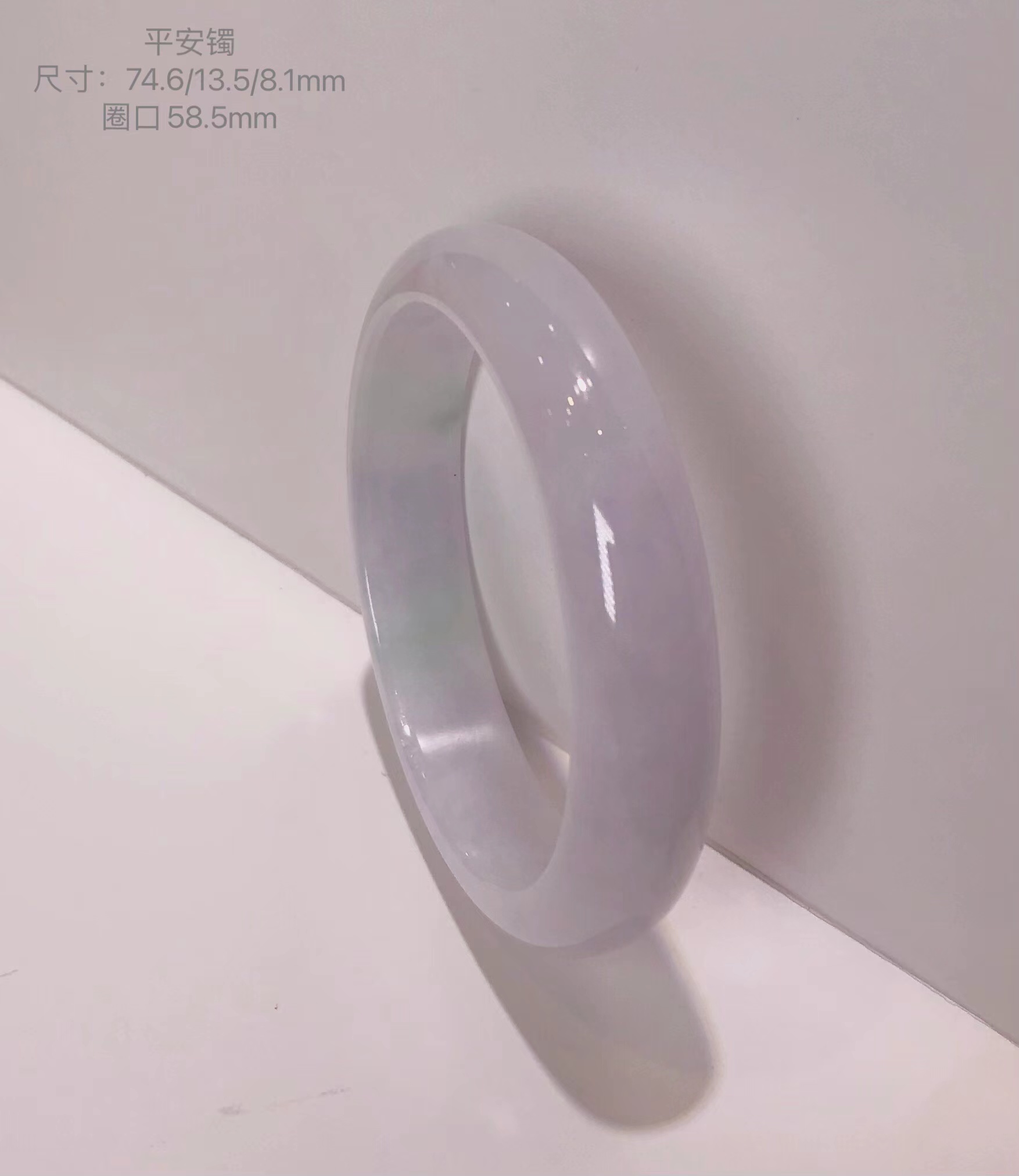 冰种翡翠平安镯:水润通透,整体非常干净,无瑕无裂,还飘少许淡紫色,清新自然,品质佳,性价比非常高,在目前翡翠原料高涨的情况下,可说是捡漏价!合适圈口的不要错过了。