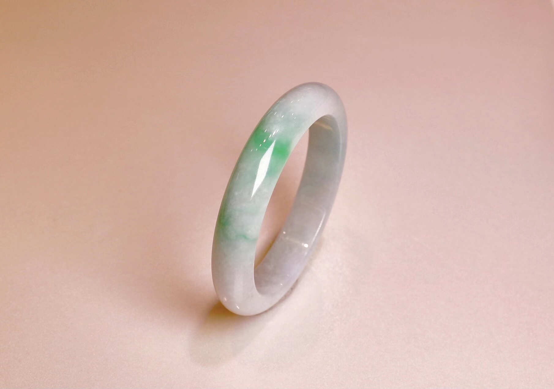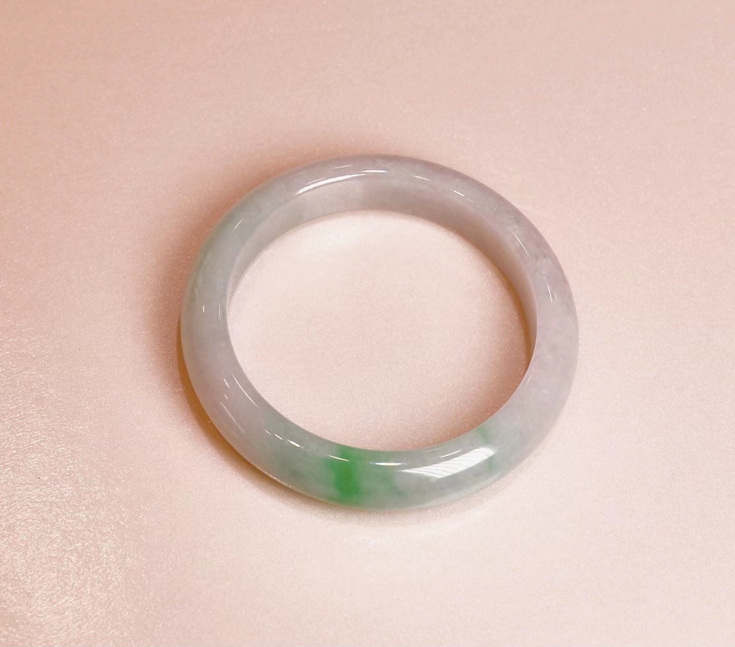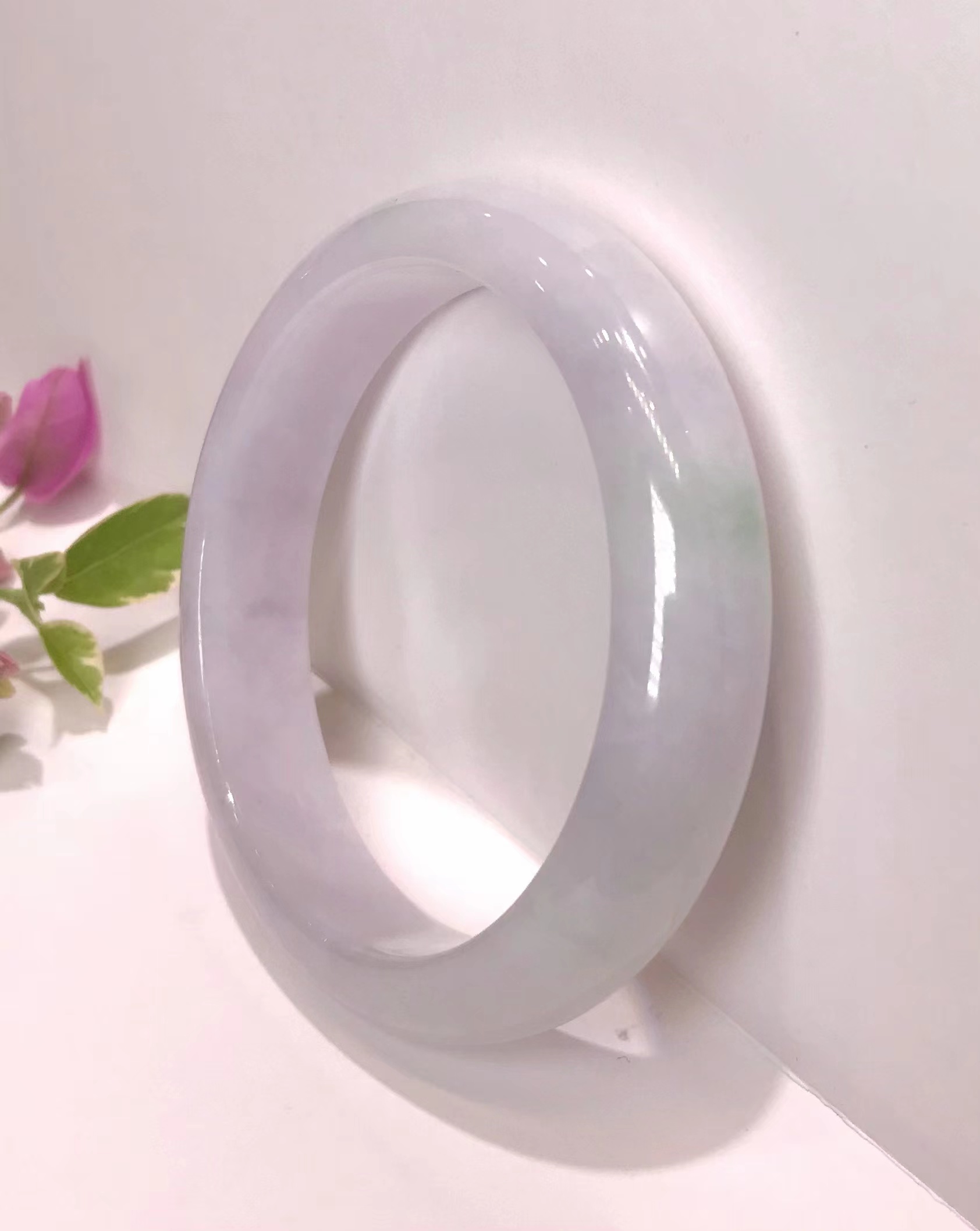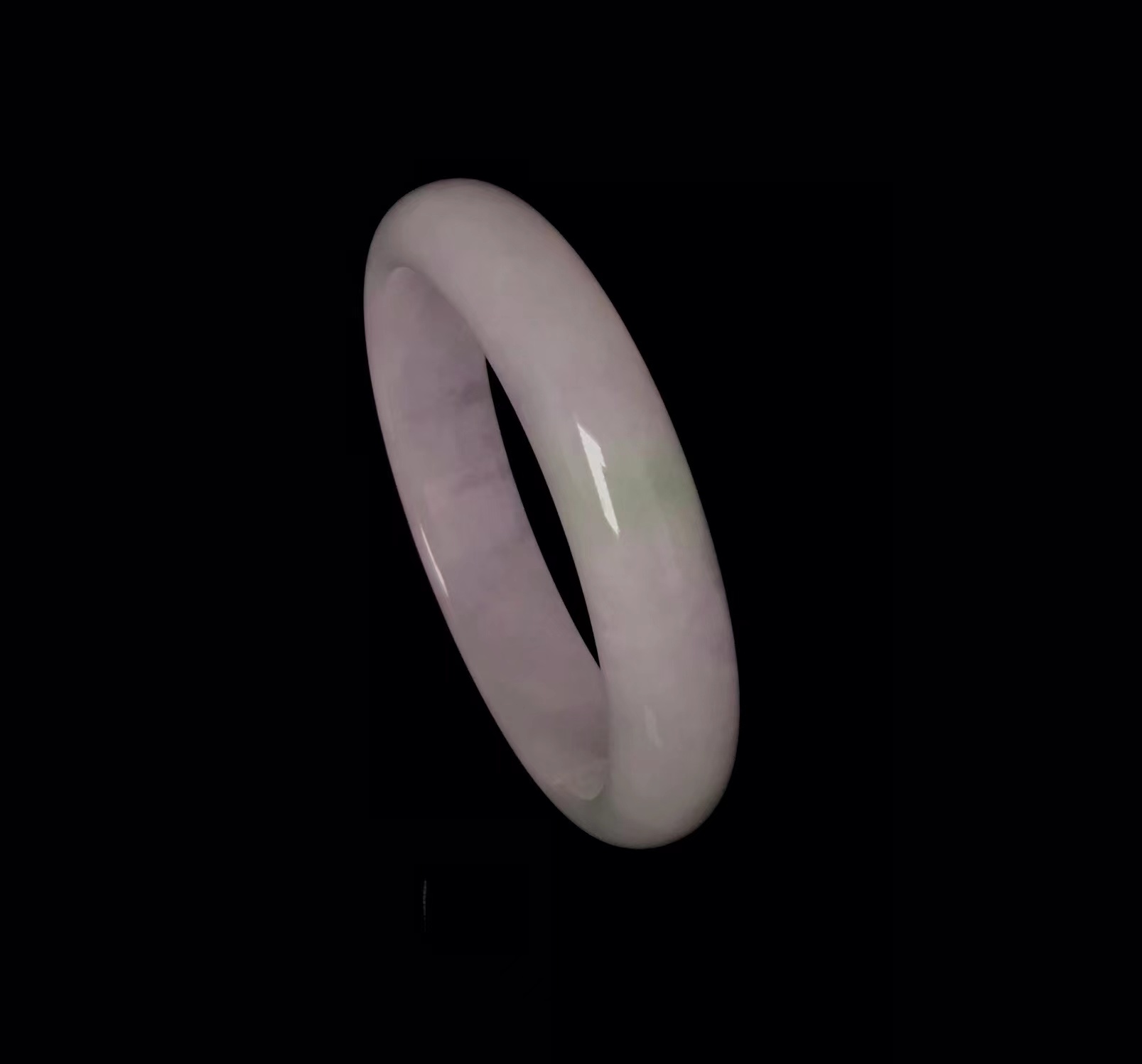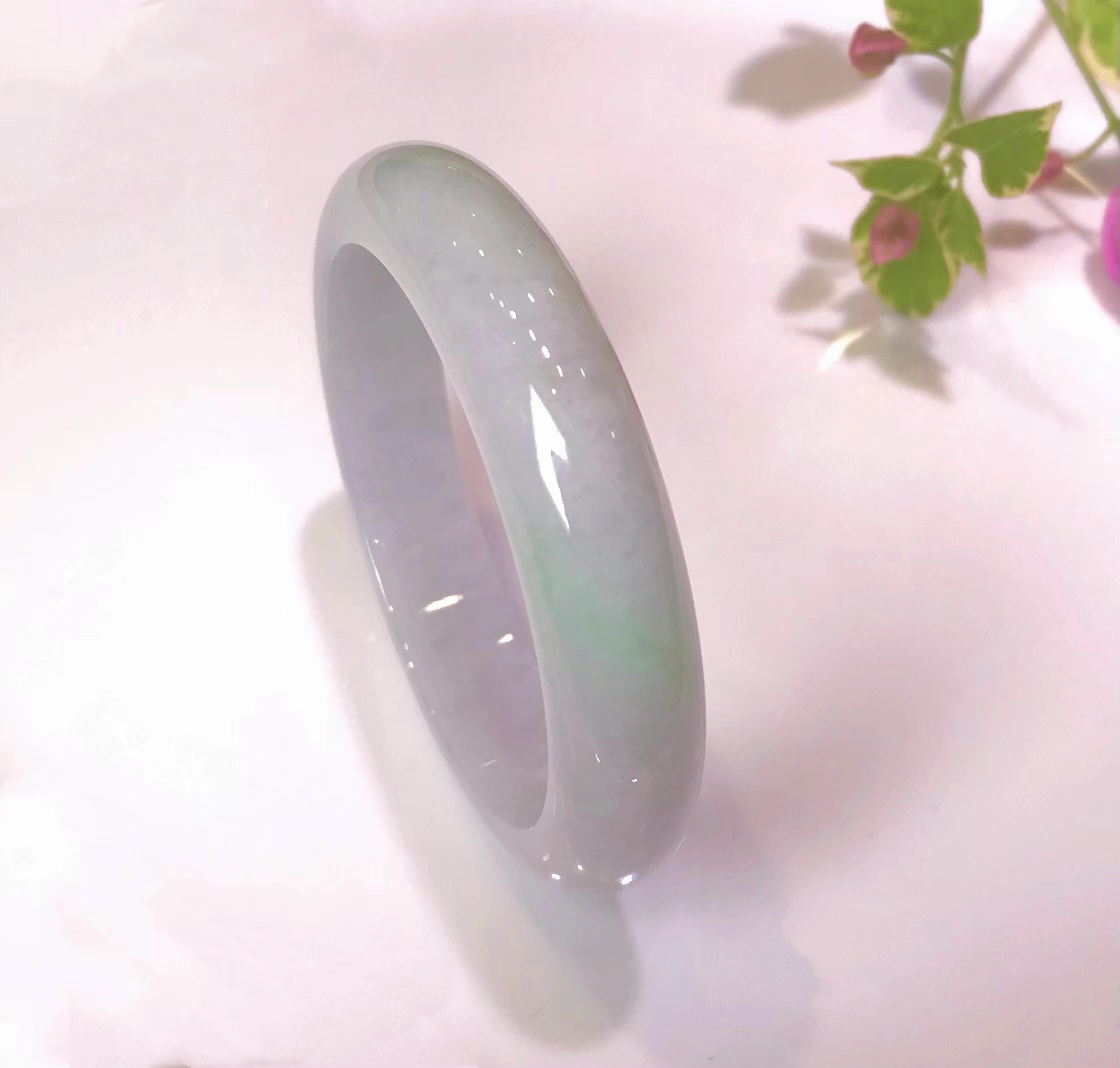 糯冰春带彩手镯,整体玉质细腻均匀,玉体厚重,一圈浅绿中,泛出一段微紫,整体干净无暇,也是难得。