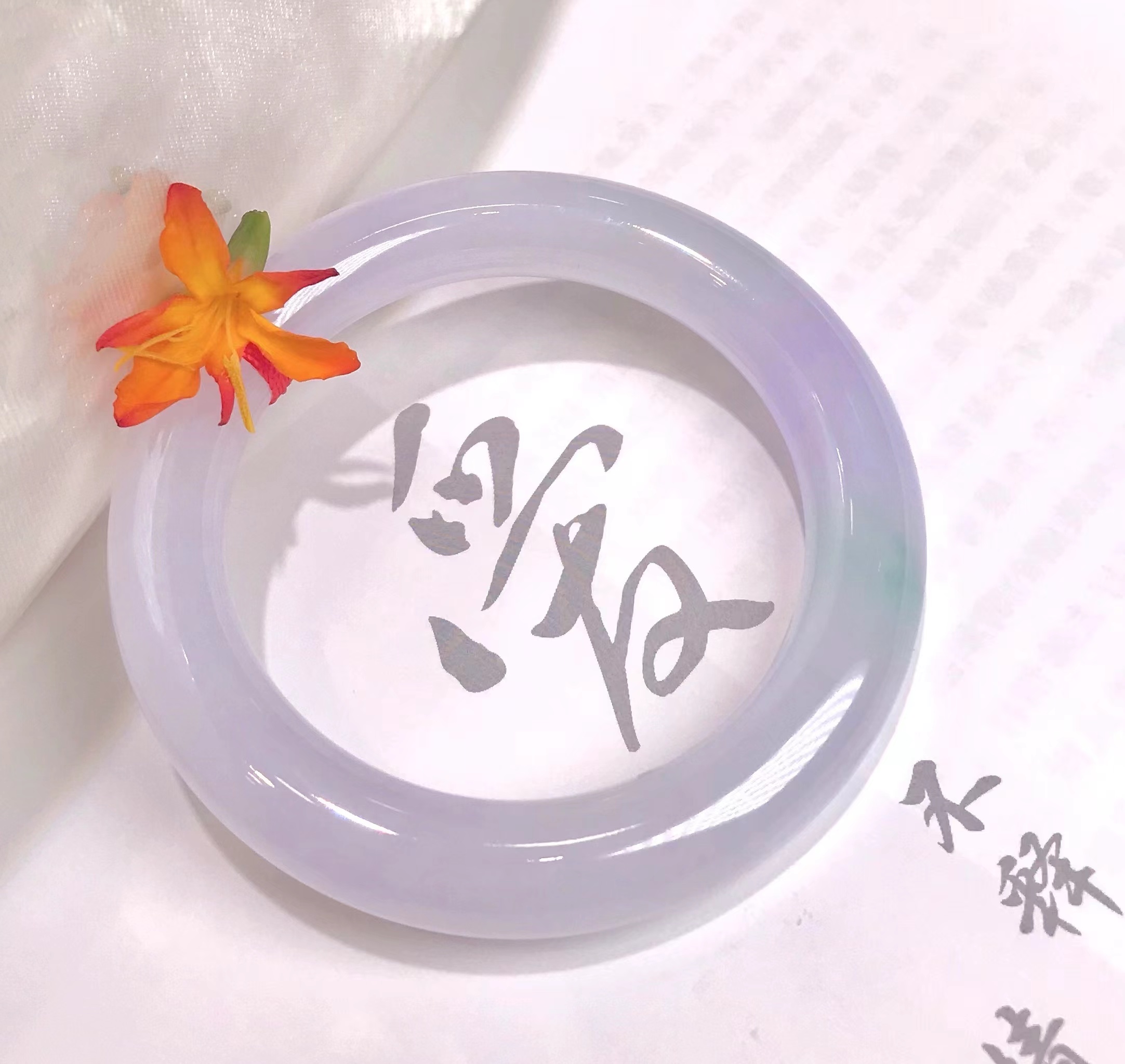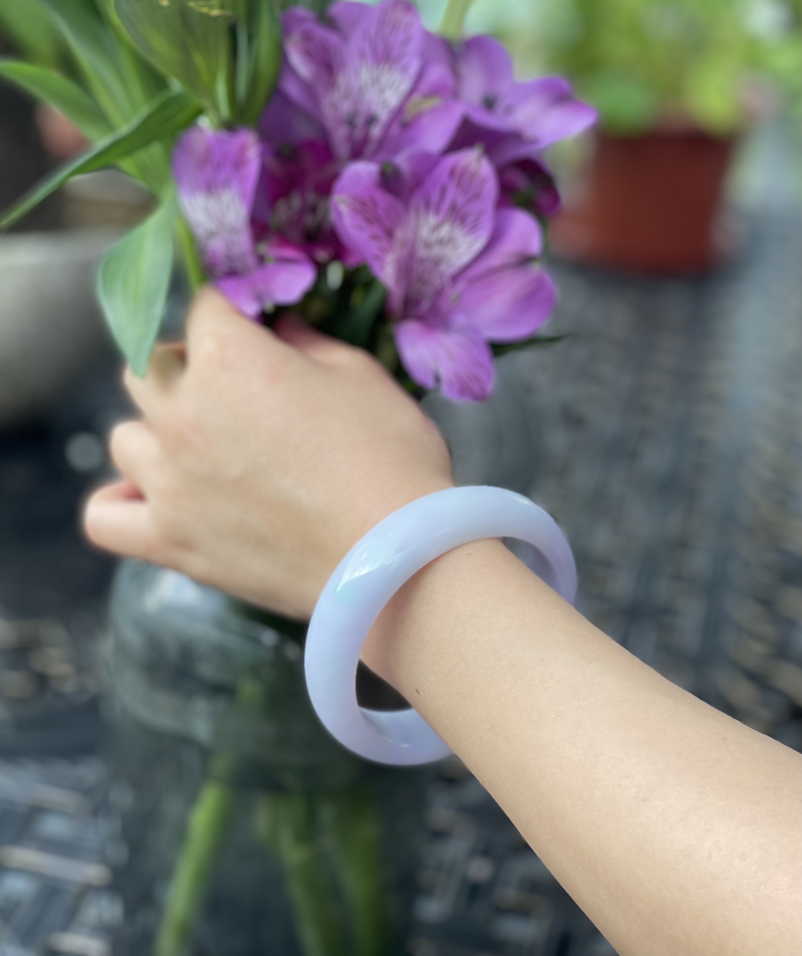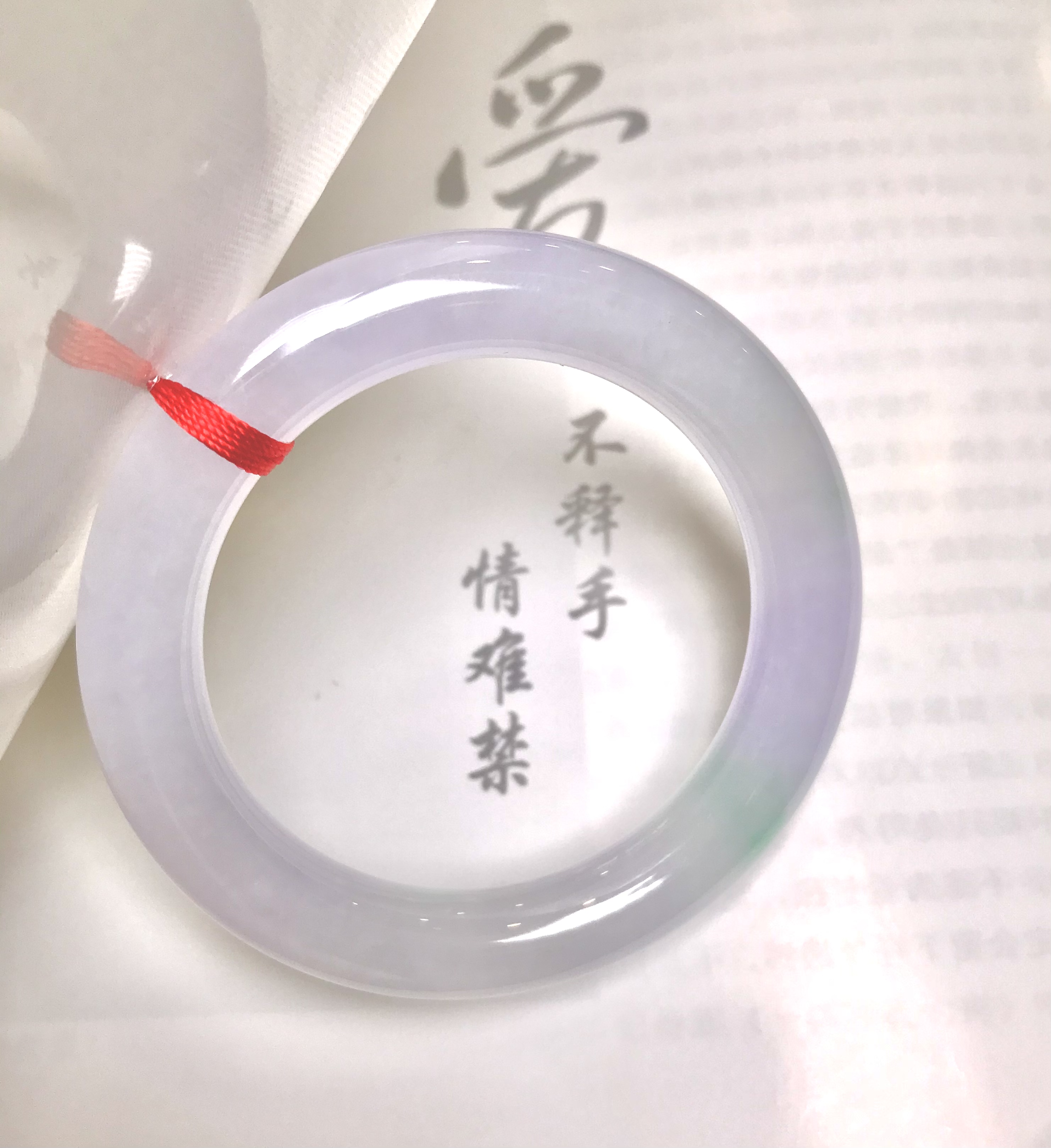 不过细看,就会有惊喜哦,每个镯子看似偏雅白,却都要么带点淡绿色,要么带点淡紫色,如冬日白雪中,显露出一朵花一片绿叶,细细品味,自有万众风情。