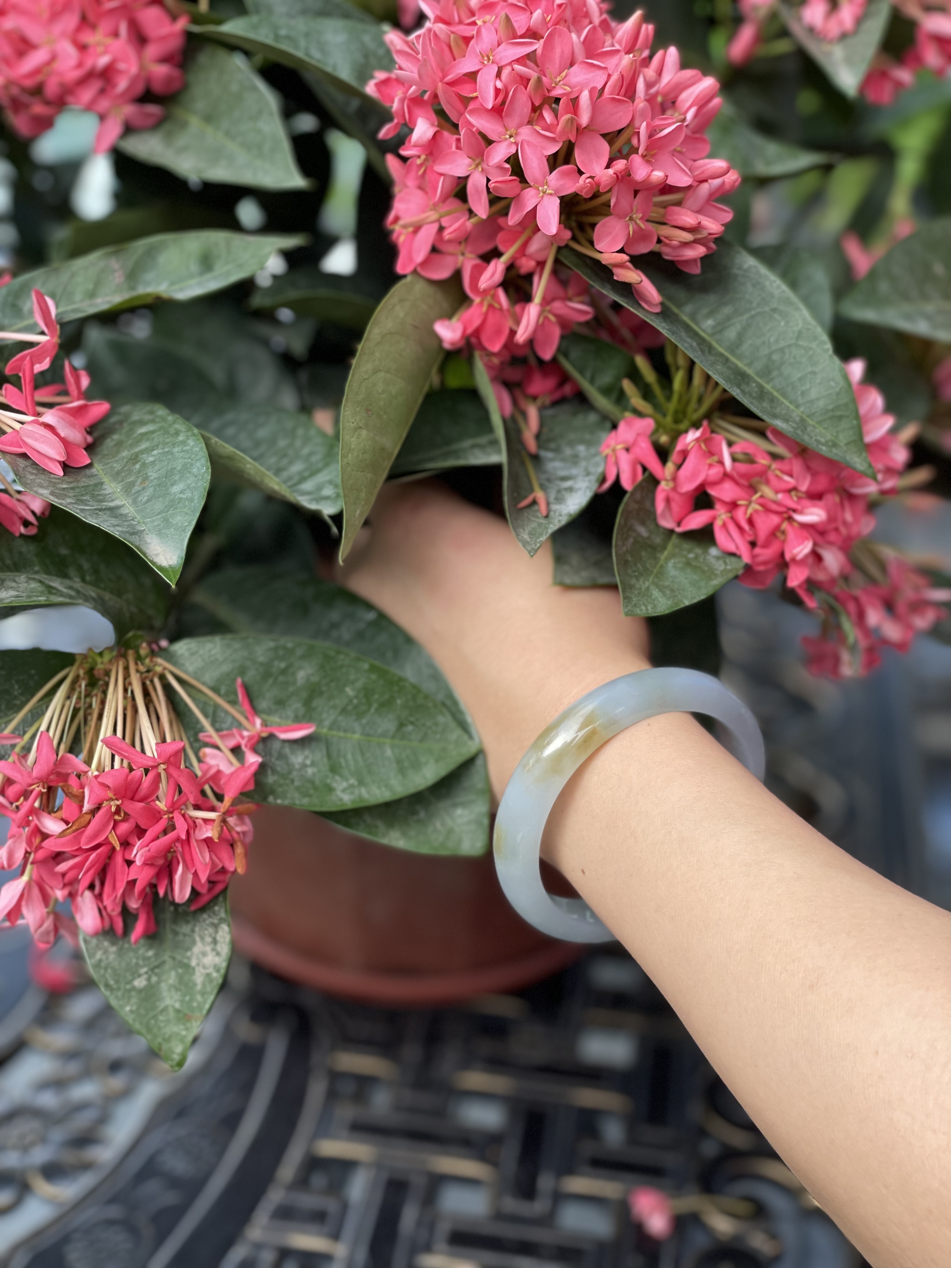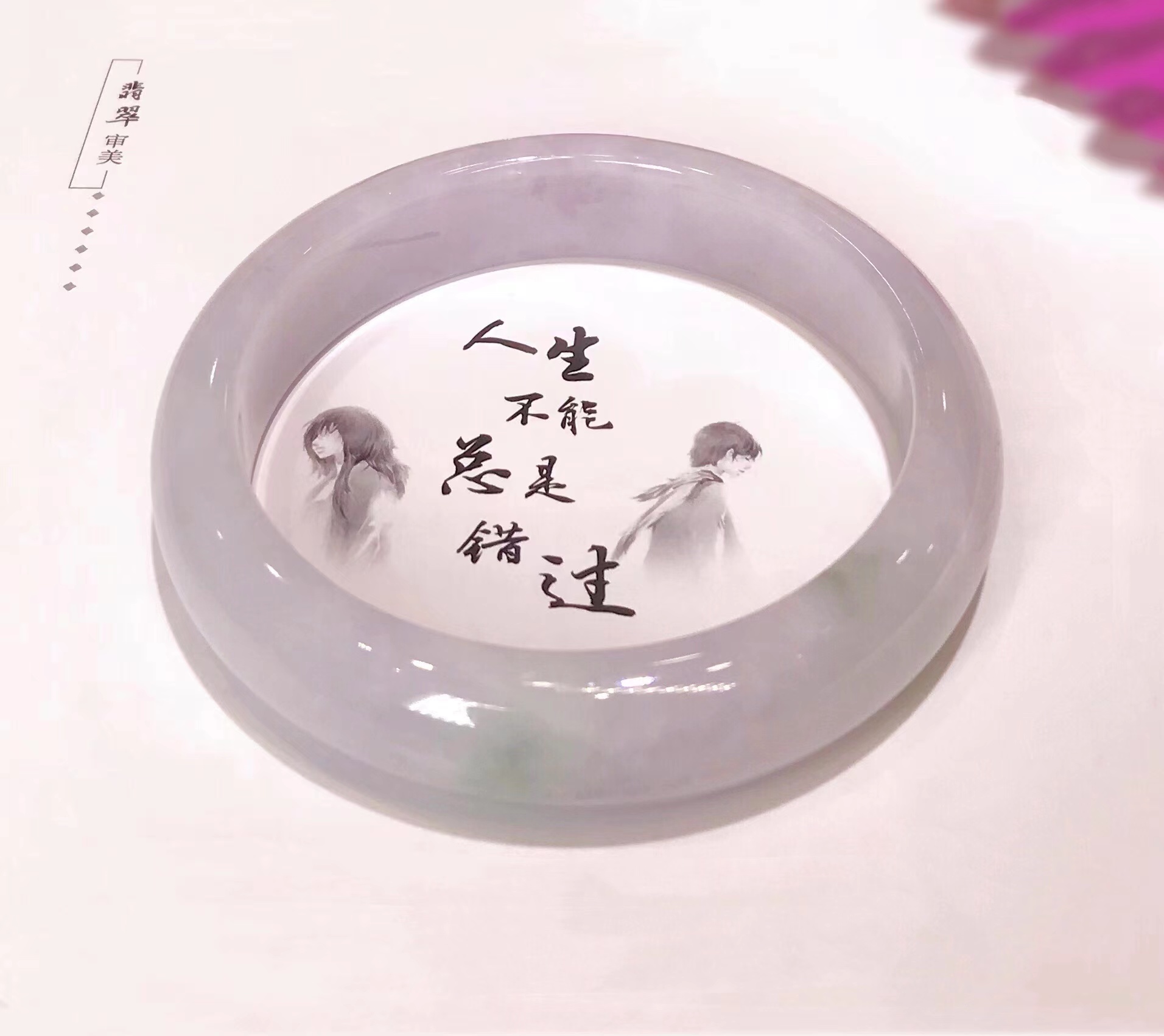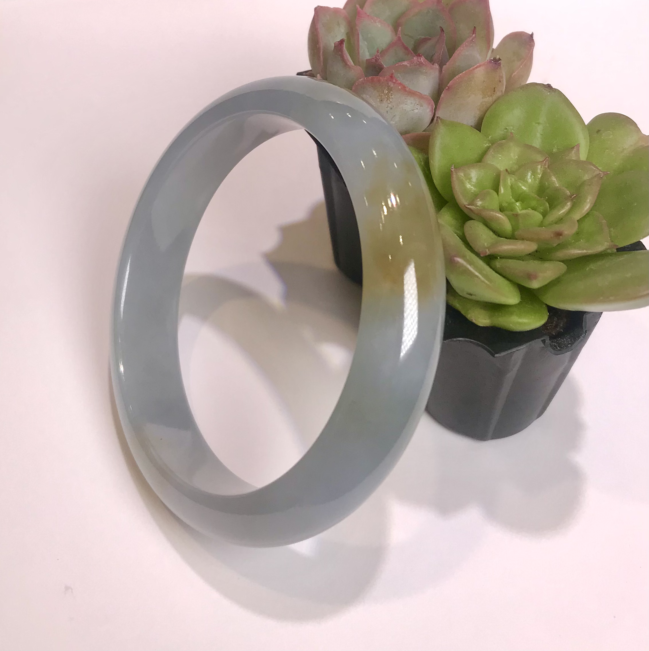 不过细看,就会有惊喜哦,每个镯子看似偏雅白,却都要么带点淡绿色,要么带点淡紫色,如冬日白雪中,显露出一朵花一片绿叶,细细品味,自有万众风情。