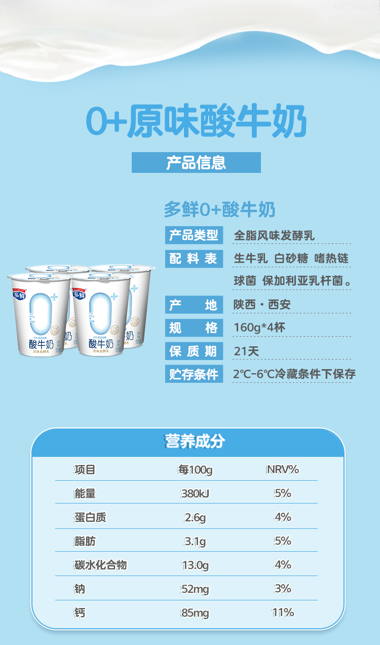 多鲜0+三连条酸牛奶160g*4杯(3件起售)