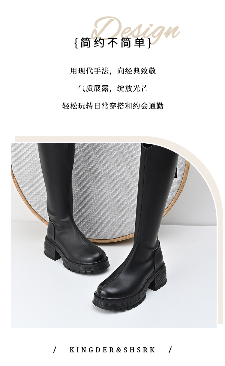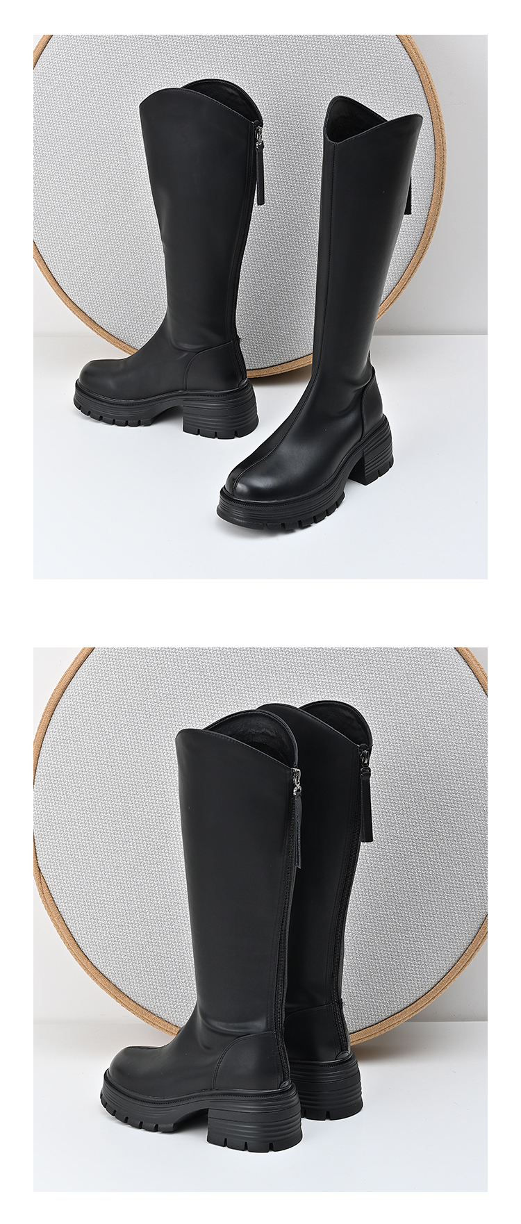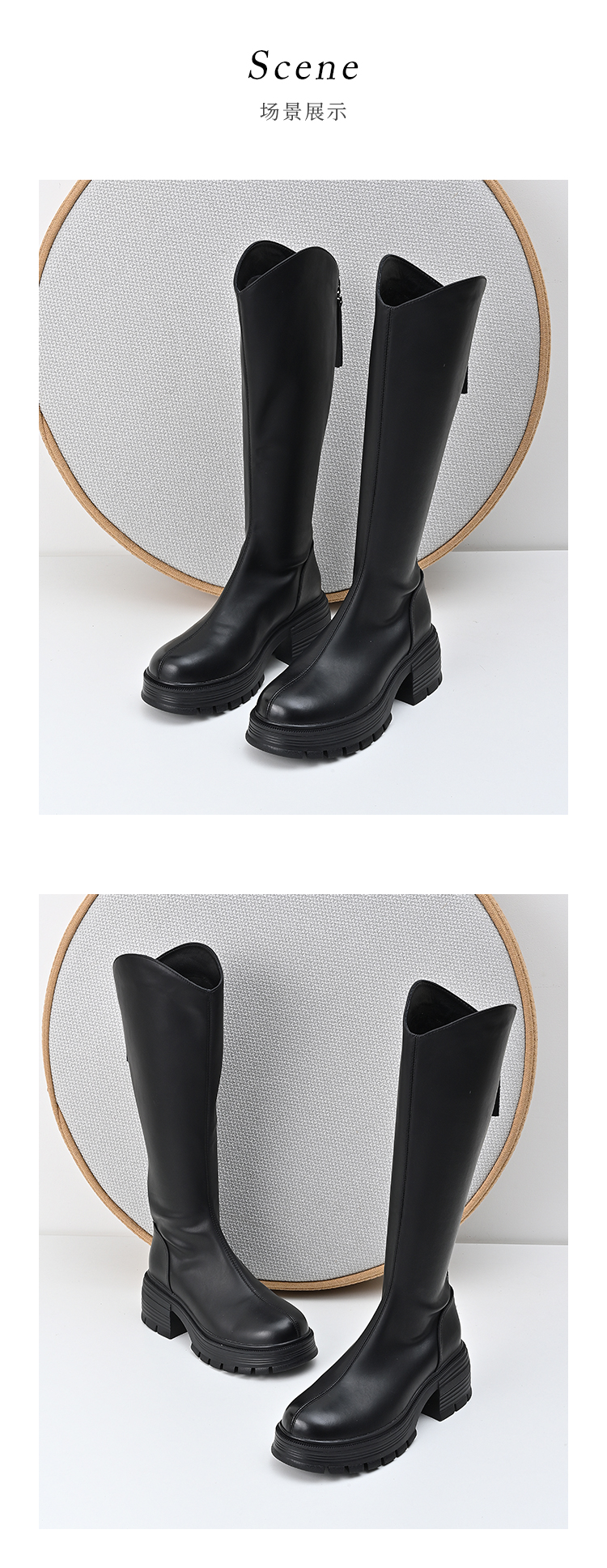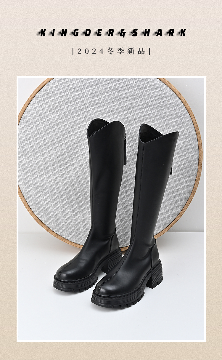 经典鲨2024冬季新款百搭圆头加绒保暖后拉链中粗跟长筒靴女KW385-D58011