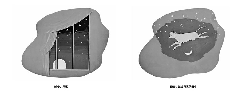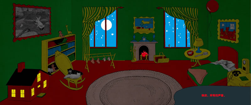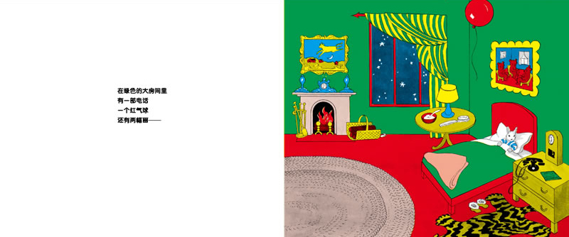 在绿色的大房间里,一只小兔子躺在床上。"晚安,房间。晚安,月亮。"他向这个灯光柔和的房间里的一切熟悉事物:三只小熊坐在椅子上的那幅画,座钟和短袜,小猫和手套,等等的所有东西,一一道晚安。