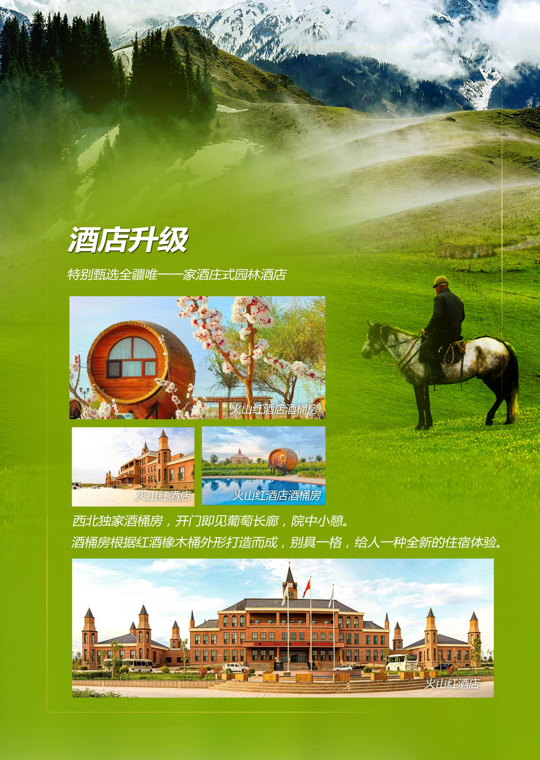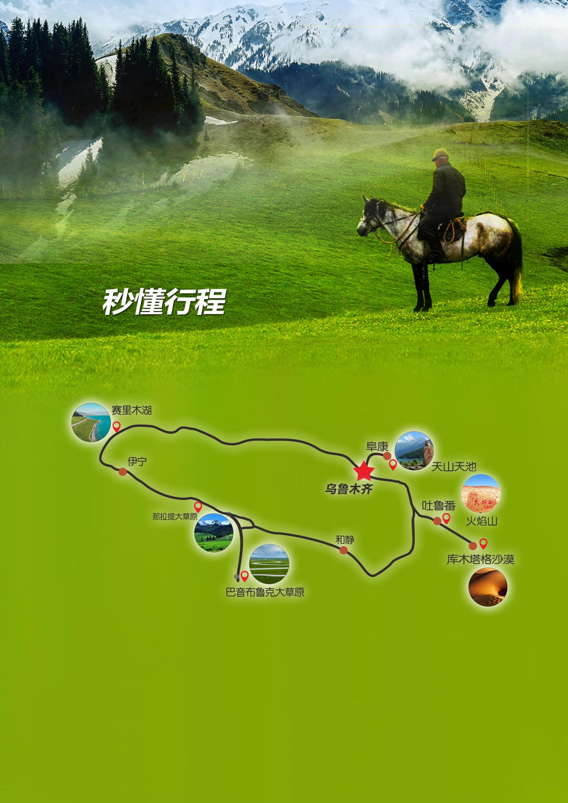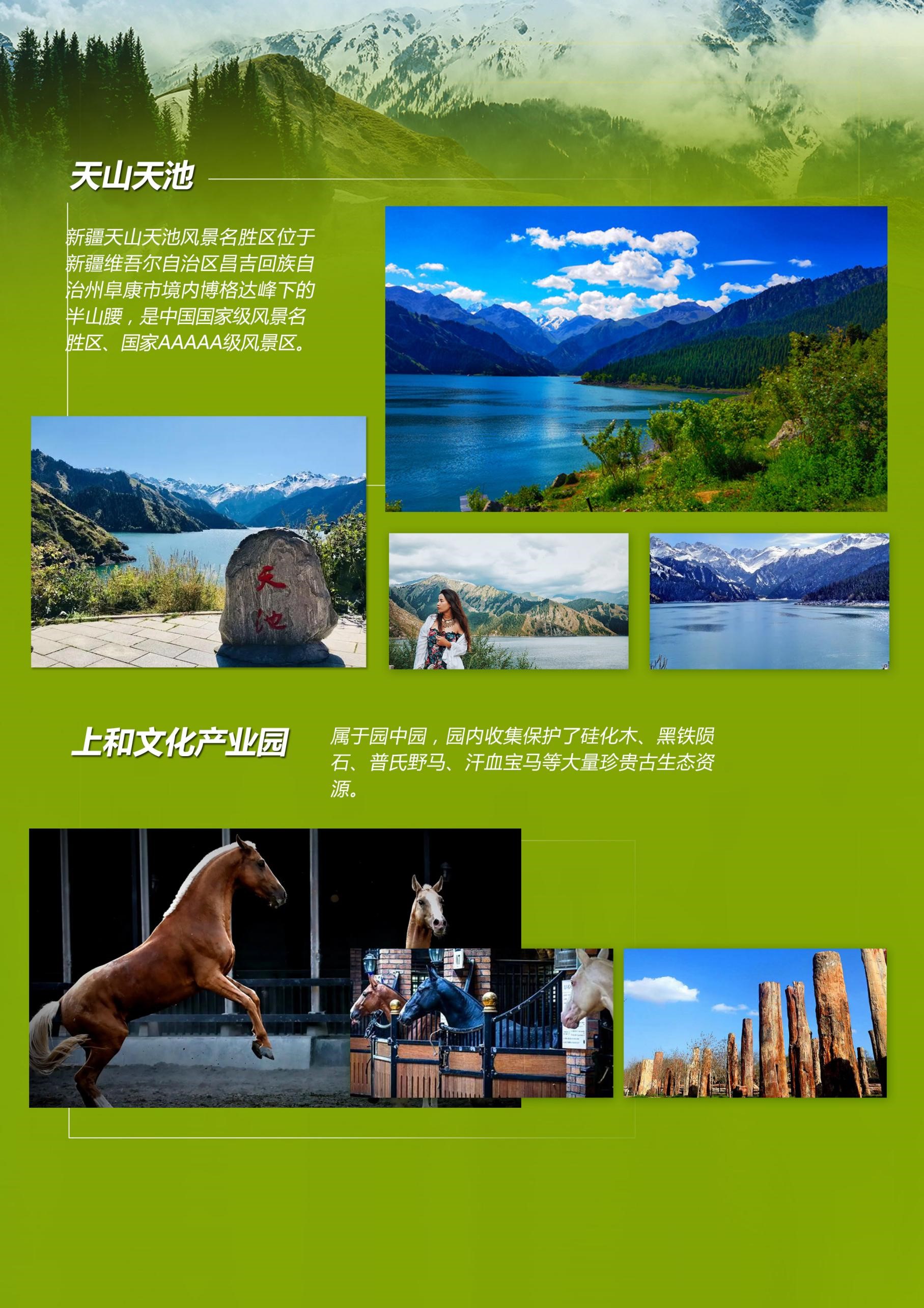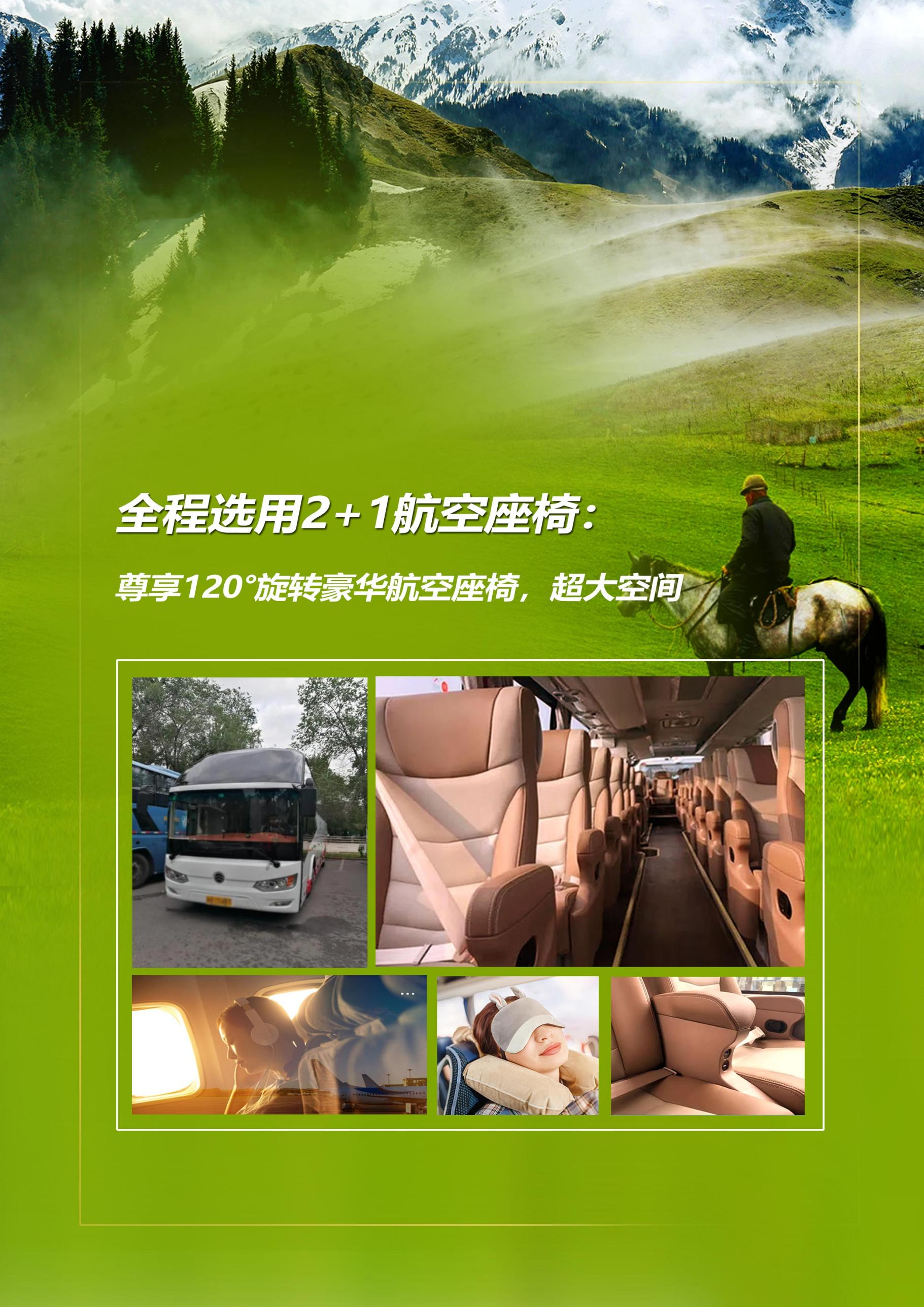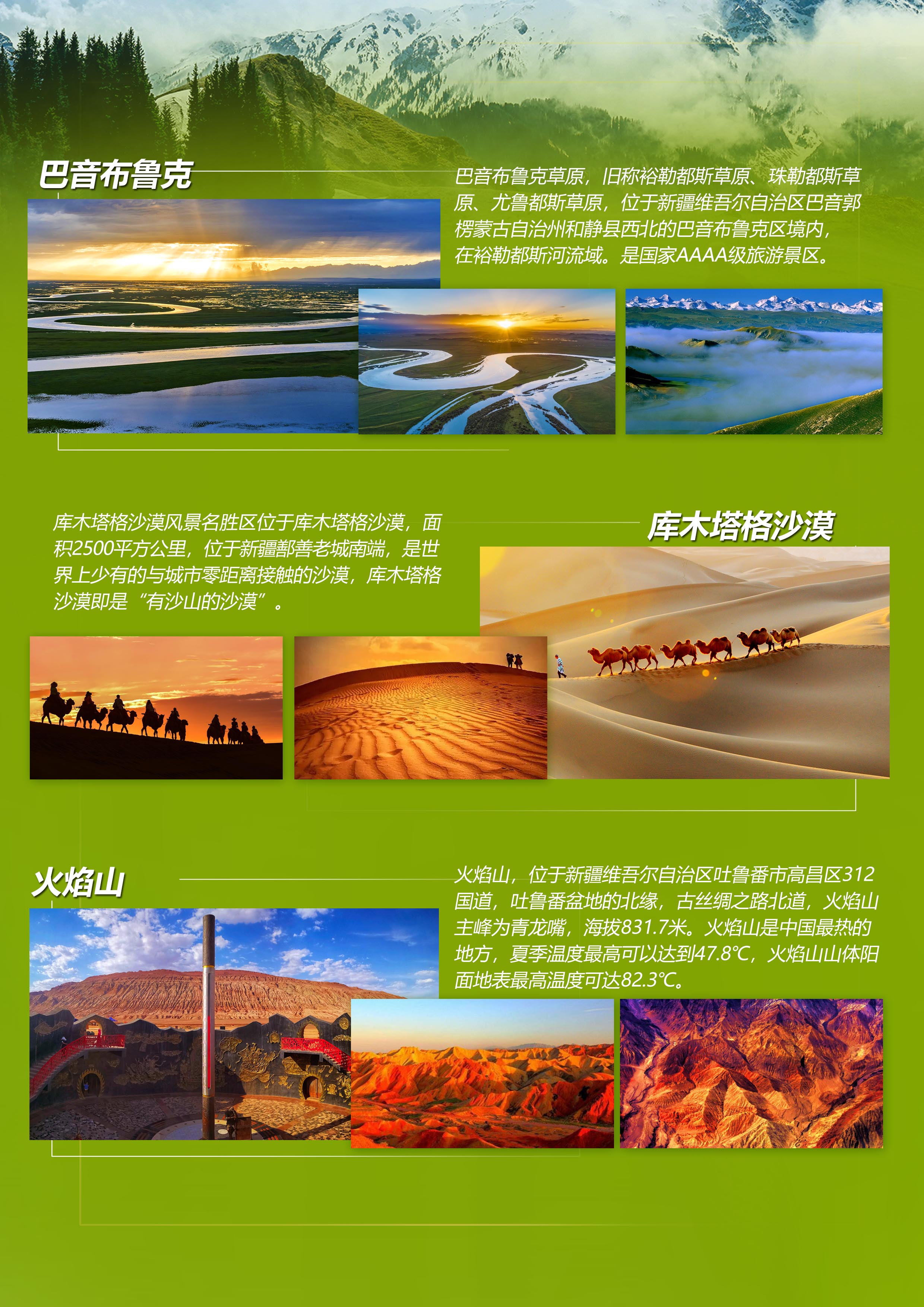 (含那拉提门票+空中区间车、赛里木湖+环湖、巴音布鲁克+区间车、天池风景区+区间车、库木塔格沙漠,上海合作组织文化产业基地)。