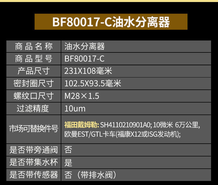 派克宝德威 BF80017-C 油水分离器滤芯 福康ISGe5发动机 6万公里
