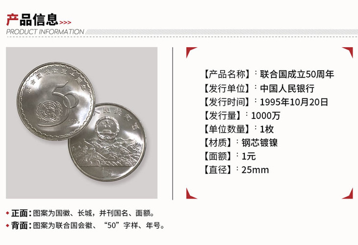 联合国50周年是历史重大的年份,具有非凡的纪念意义。且属于早期纪念币,发行量与现在相比少得多。