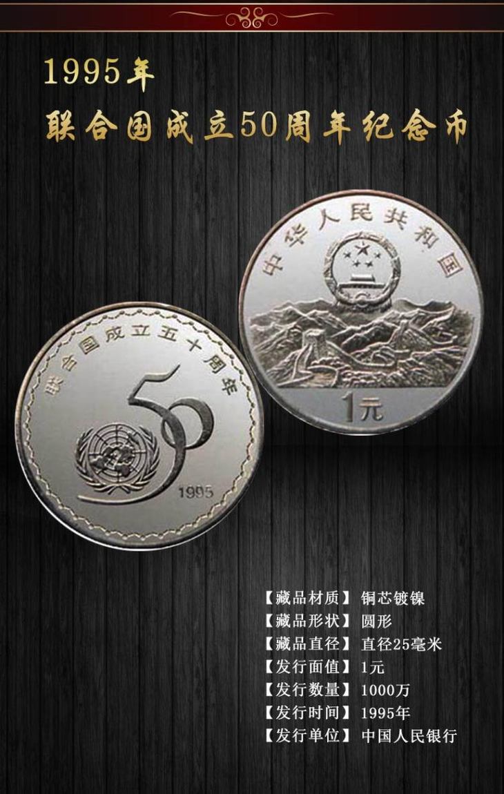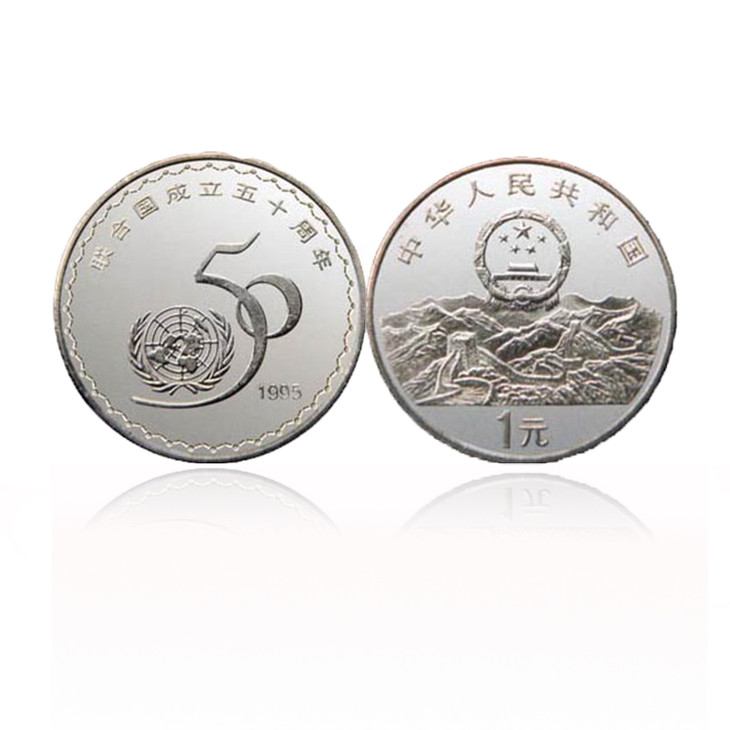 1995年,适逢联合国成立50周年,中国人民银行特别发行流通纪念币一枚,面值1元,发行量为1000万枚。
