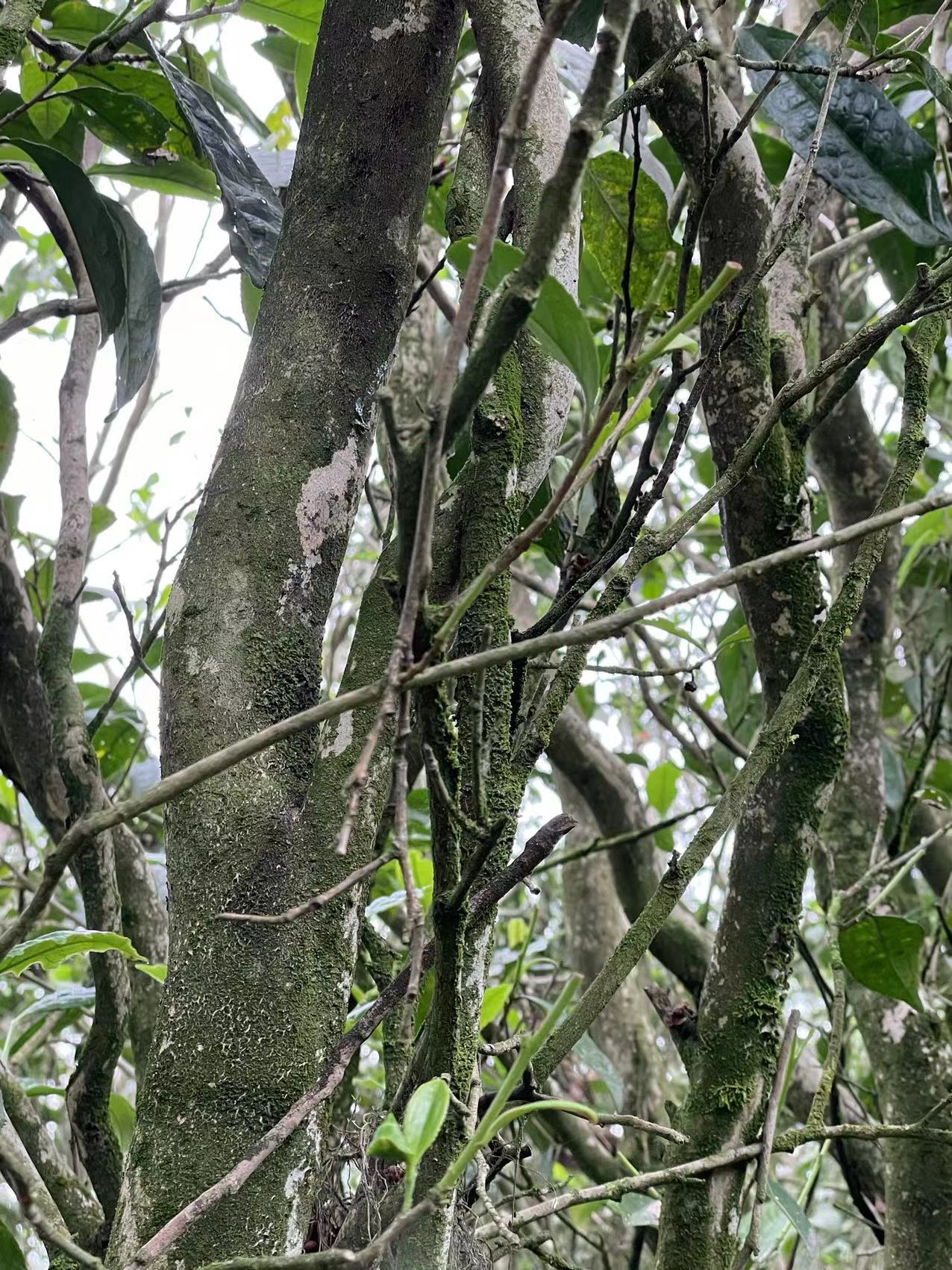 采摘时够不着只能可以爬树。老张(茶树主人)亲自示范。