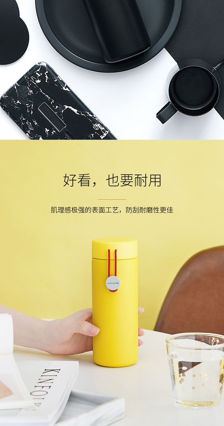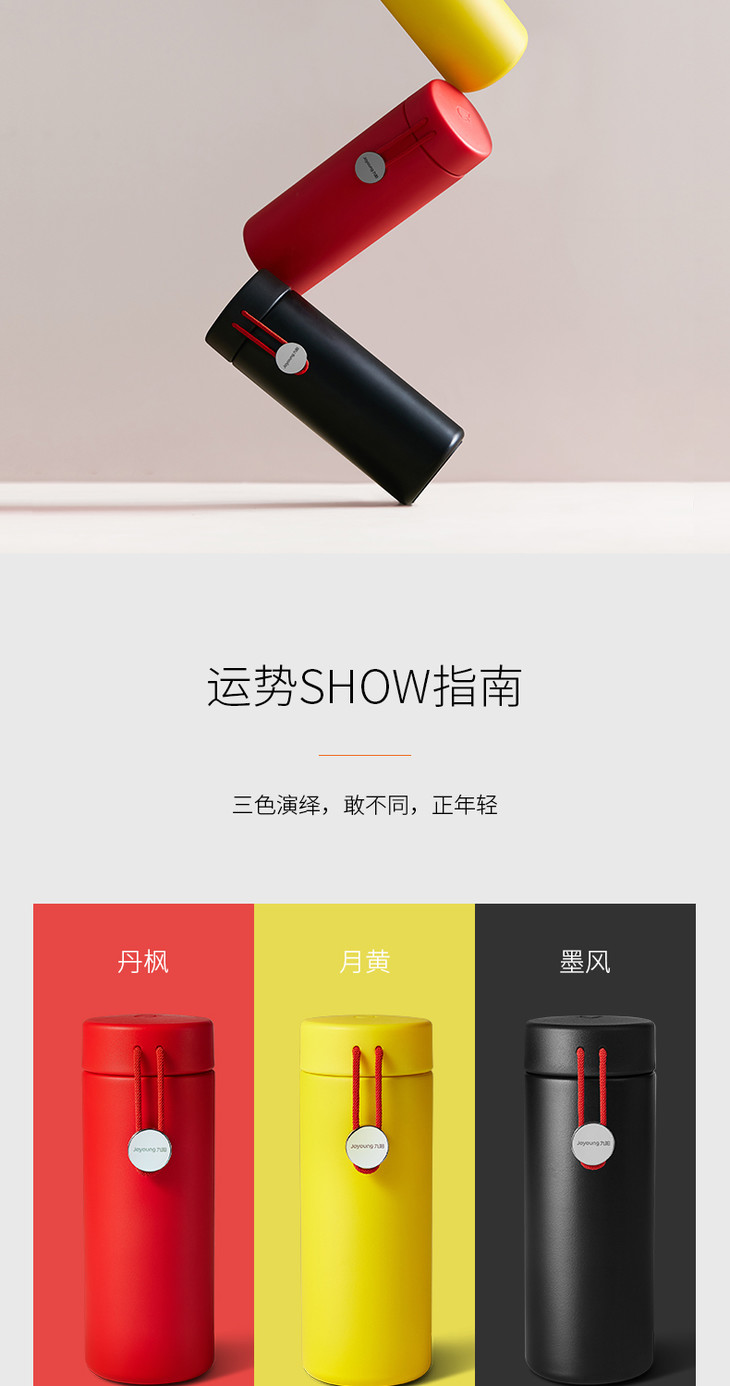 作为一个杯控,我深深同意如下观点:丑的保温杯千篇一律,美的保温杯各放异彩。“美”真的是成为超越年龄层的存在。比如九阳小红绳保温杯就是如此。丹枫红、月夜黄和墨风黑三色,或喜庆或乖萌或冷峻,基本上能够hold住各种个性各种风格人群的需要,可以说是非常讨喜。更加有趣的是,保温杯还会随机附赠一组好运贴纸,贴在红绳的吊牌上,可以说是忙碌生活中不忘调侃自己的小趣味,也总能让看到的人会心一笑。