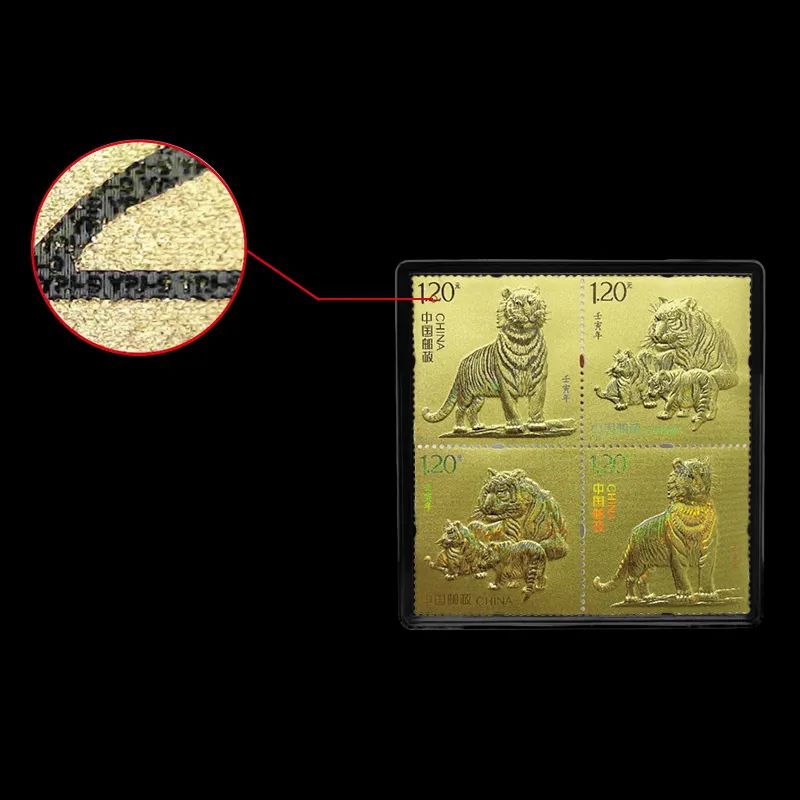 虎年邮票金使用了四方连的形式,在2克重的金片上采用了浮雕微刻、冷压起鼓、镜面磨砂、全息幻彩等高级工艺,还原了邮票原本的浮雕立体效果,手感极佳!在不同的光线角度下,邮票金表面会展现出华丽的幻彩效果!