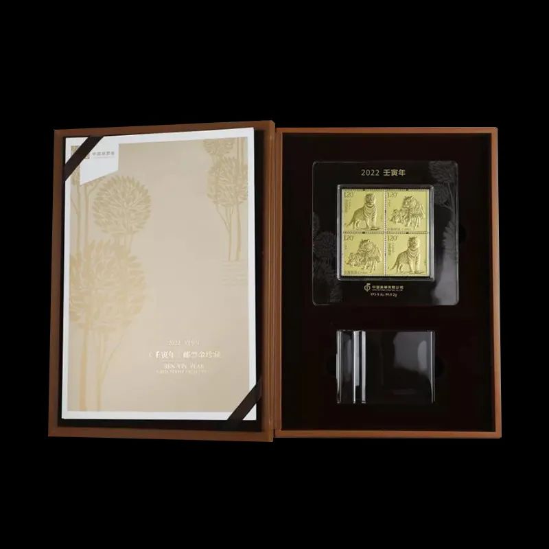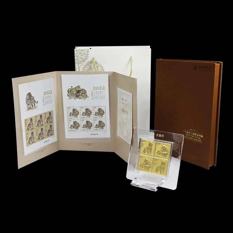 邮票金带高品质书形包装,除了邮票金本体外,还额外赠送高透亚克力展示架、虎年邮票小版(2版邮票共计12枚),大家可以过年的时候把这个邮票金摆在桌子上,极具格调!