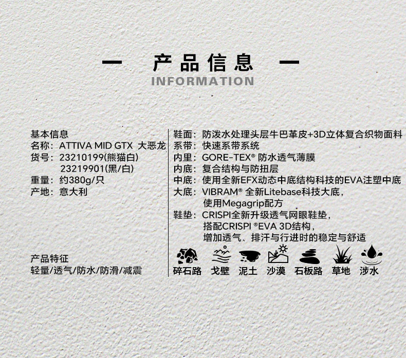 CRISPI春秋户外防水防滑透气轻量化徒步登山鞋靴男女大恶龙 Attiva Mid GTX 10199/19901