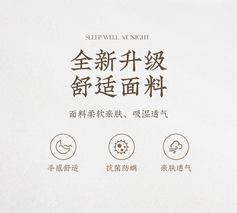 a.【抗菌防螨面料】:本产品面料经过专门配方特殊处理,有效抗菌防螨,符合GB/T 20944.3-2008、GB/T 24253-2009国家标准