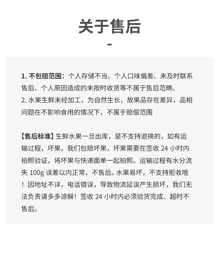 请签收前确认包装完好。如有坏果,请在签收后24小时内,坏果与快递面单一起拍照,按比例赔偿。