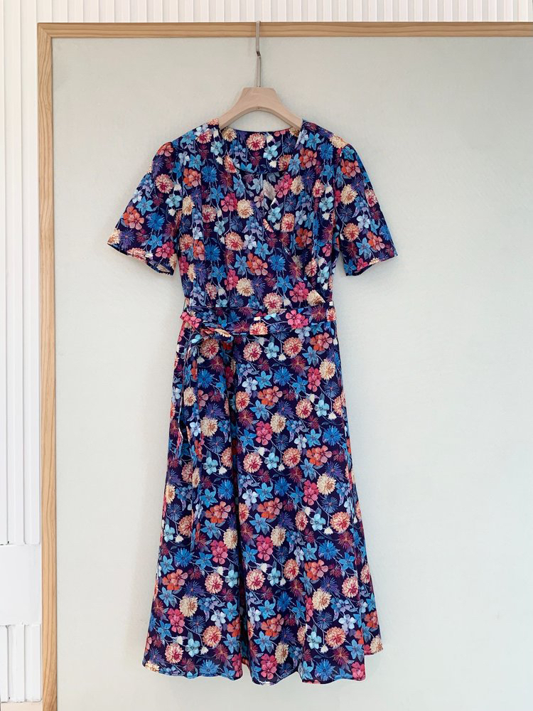 棉弹印花细布中长款连衣裙 裹裙式V领连衣裙 腰带设计 V领视觉拉长颈部线条 膝下5cm黄金分割 恰到好处的裙长 行走的优雅时光
