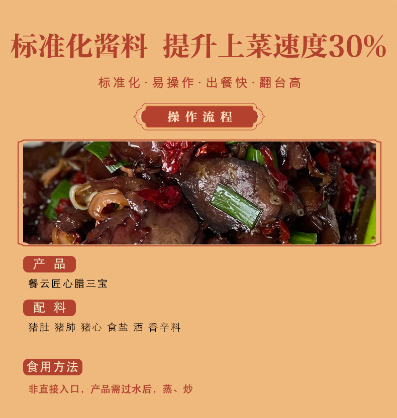 餐云匠心腊三宝熏制工艺在传承和还原传统工艺,结合现在餐饮消费特点,通过工艺优化真正做到低盐品质,无需反复焯水去盐,最大化保证腊三宝的原味,让记忆的味道更深入人心。