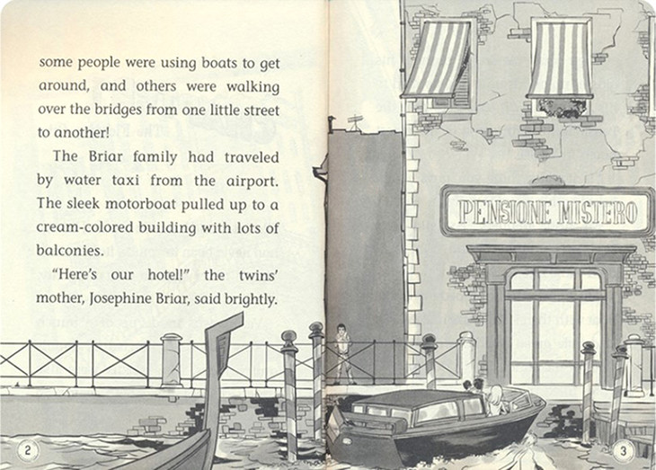 当伊桑和艾拉第一次来到威尼斯时, 他们特别兴奋,想在卡勒法尔内斯附近寻找一幅500年历史的镶嵌画,哈里爷爷给他们讲了这件事。第二天早上,双胞胎听到两个船夫在争吵,其中一个指责另一个偷了他最漂亮的船。船夫恳求伊桑和艾拉帮他找到船。双胞胎能找到被盗的贡多拉和他们爷爷zui喜欢的镶嵌画吗?