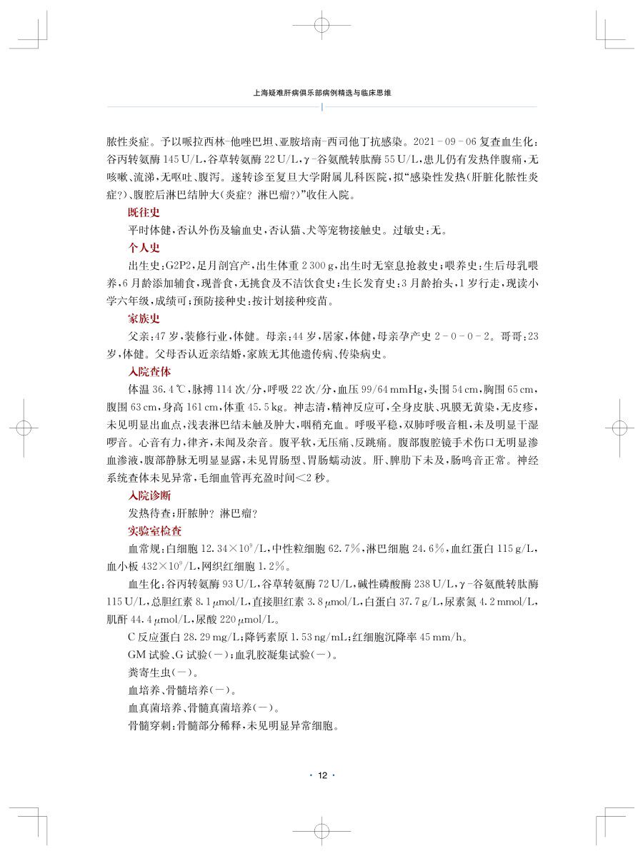 本书收集了2019-2021年海疑难肝病俱乐部菁英论坛的29个精彩案例,由海疑难肝病俱乐部专家委员会评议,并按照感染、自身免疫、遗传代谢、肿瘤、血管等病因进行分类。书中收录了许多临床非常罕见的疾病,如肝移植后新发IgG4相关自身免疫性肝炎、多种酰基辅酶A脱氢酶缺乏症、巴尔通体肝脓肿、肝脏黑色素瘤、肝淀粉样变性、肝豆状核变性相关肝衰竭、POEMS综合征等。通过编者细致的病史整理,展现了诊治过程中柳暗花明、峰回路转的曲折经历,也体现了严谨的临床分析推理和优选的诊疗技术手段。