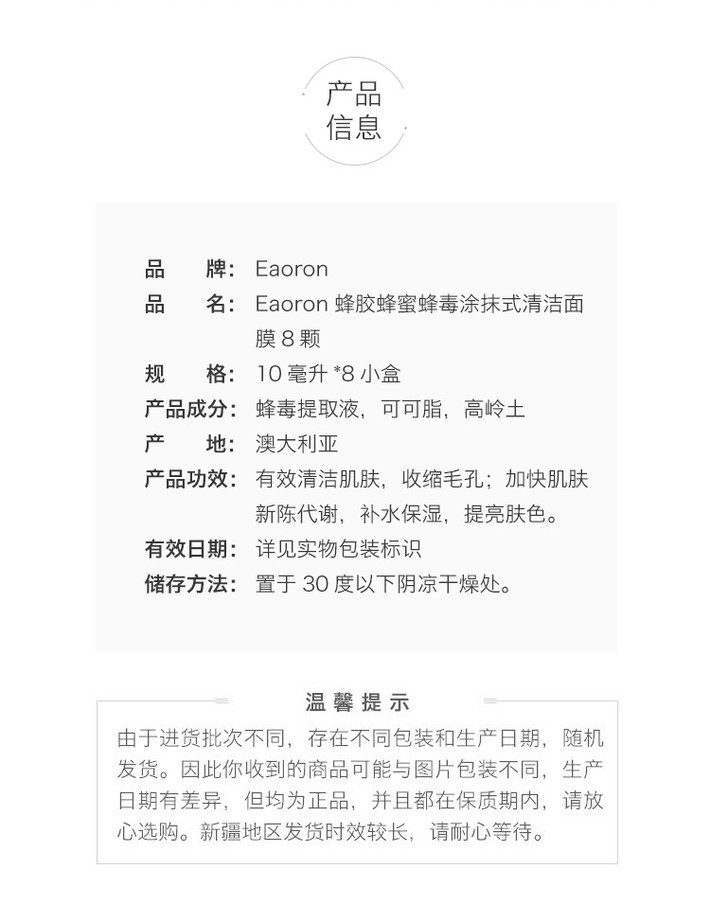〖澳洲〗EAORON 蜂毒涂抹式面膜 10ml*8杯 补水保湿晒后修复紧致亮肤面膜