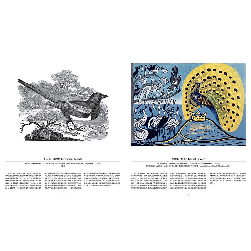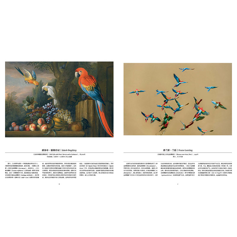 本书打破年代的界限,将这些作品以具有视觉冲击力的顺序进行编排,不同图像巧妙地并置于同一对页中形成对照,引发人们对其相似性与差异性的思考:18世纪为东印度公司赞助人创作的精美细密画体现了莫卧儿王朝特色和欧洲传统风格的结合,与鸟类弹响电吉他的当代装置艺术形成鲜明对比。无论是实景式立体布景中的生动标本,书法笔触勾勒的速写,还是大理石雕刻的塑像,鸟类始终激发着人类深层的惊奇感,激励我们不断观察、记录、理解并守护这些翱翔天际、栖息大地、遨游海洋的生灵。