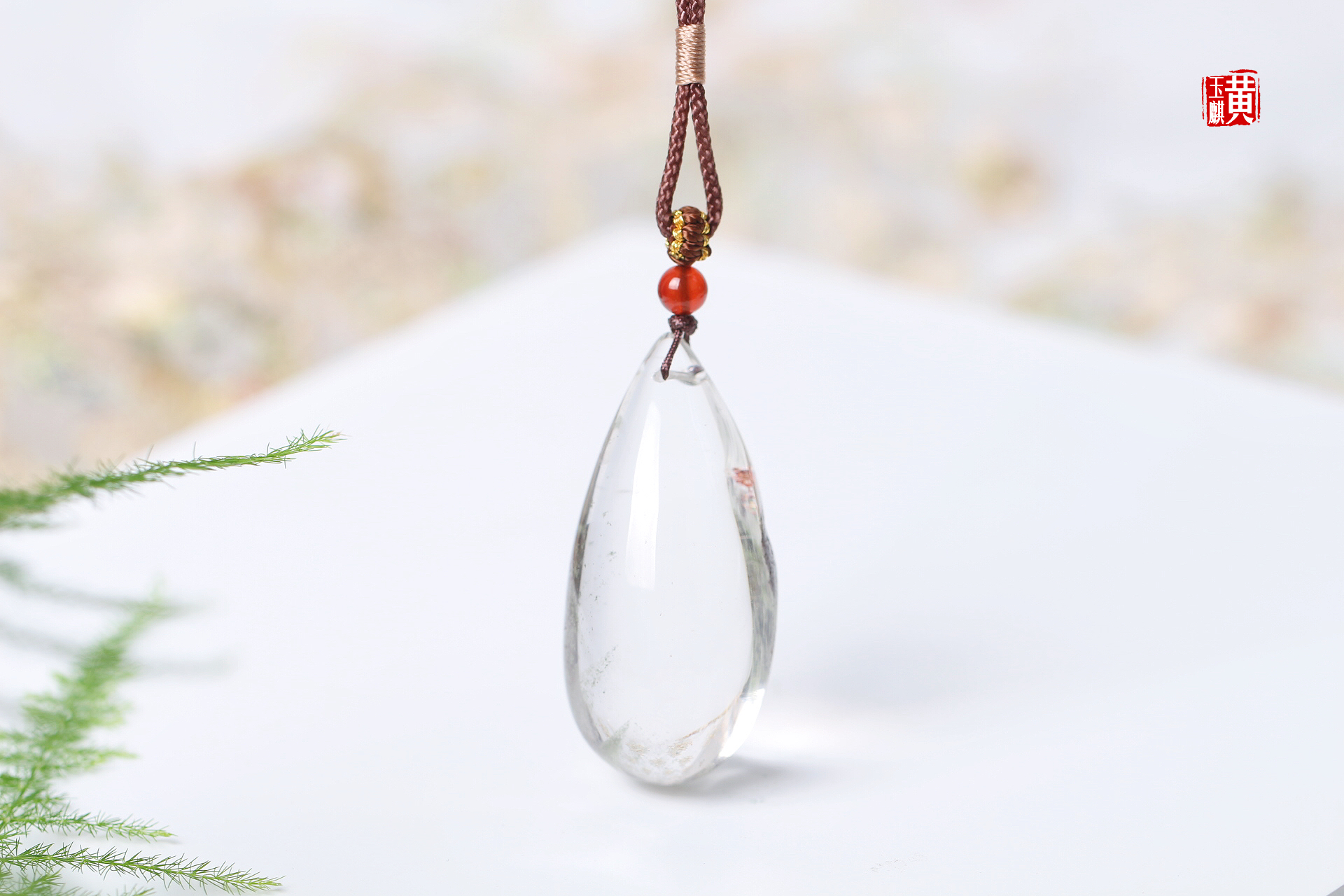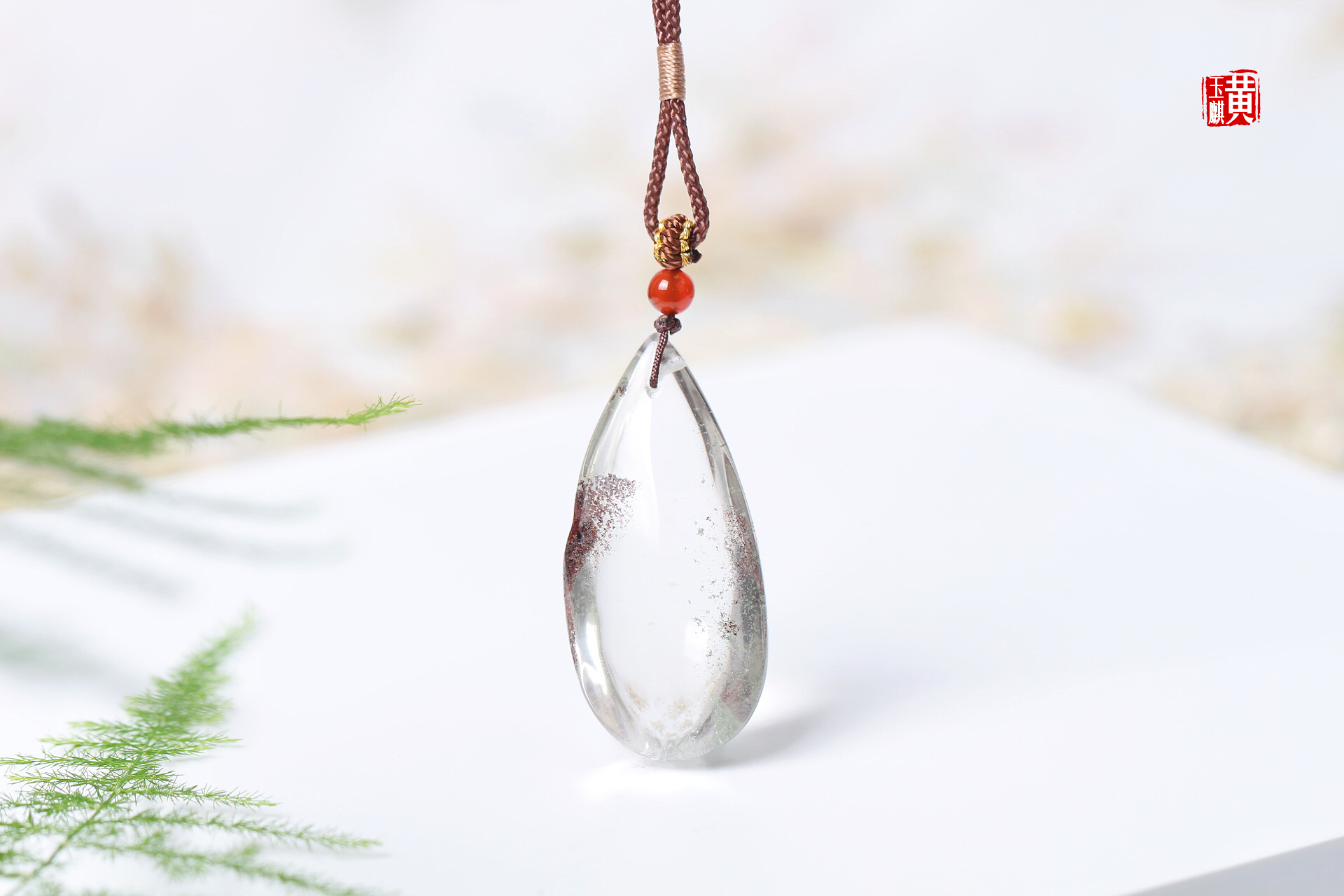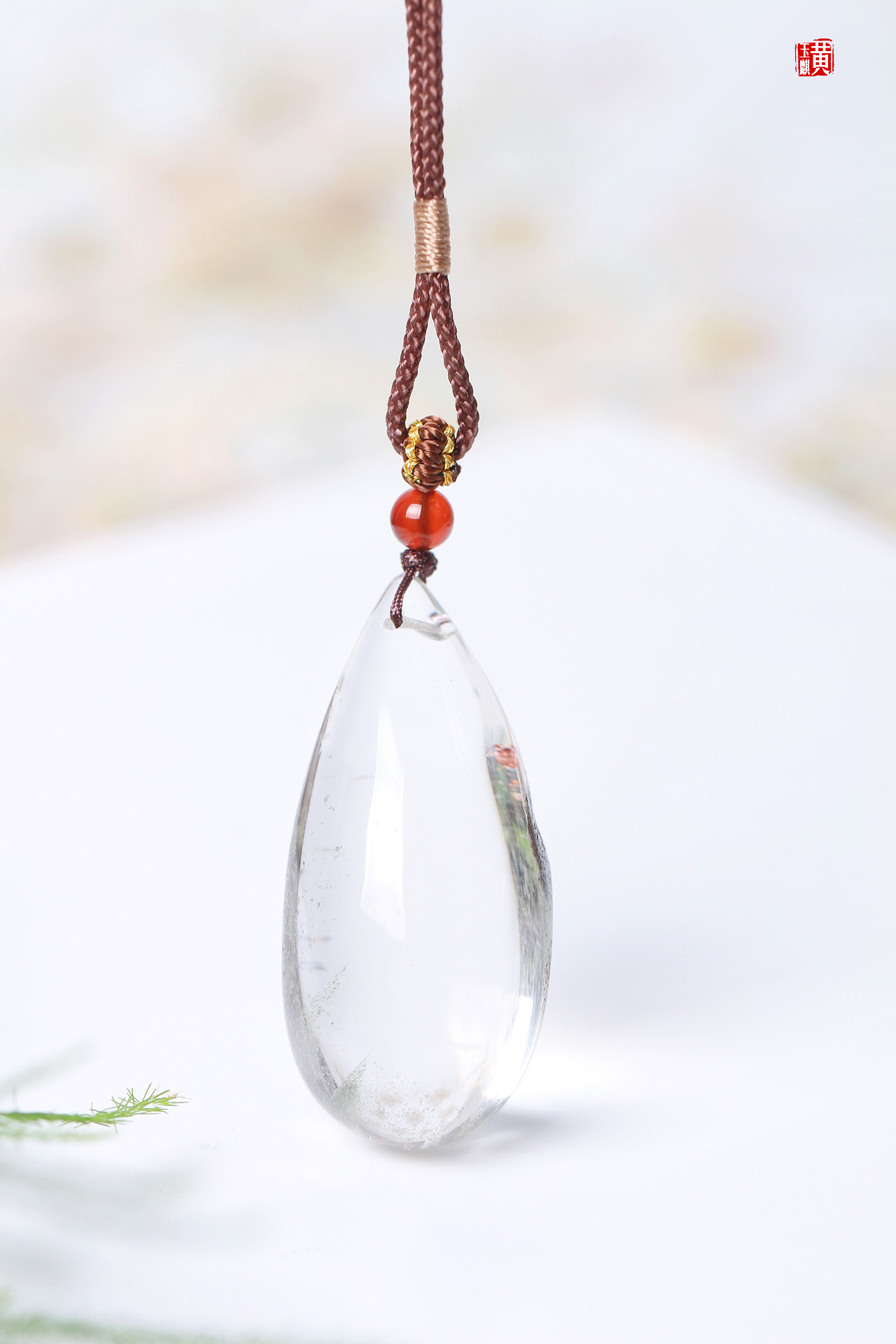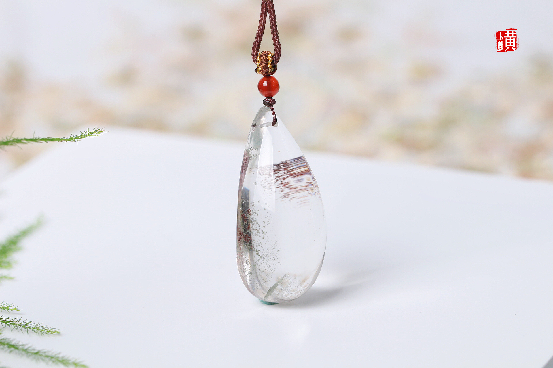 绿幽灵水晶吊坠,晶体通透明亮,宝瓶状,内含些许绿幽灵和红幽灵,灵动雅致,佩戴清清爽爽,寓意有财运兴旺、事业有成。