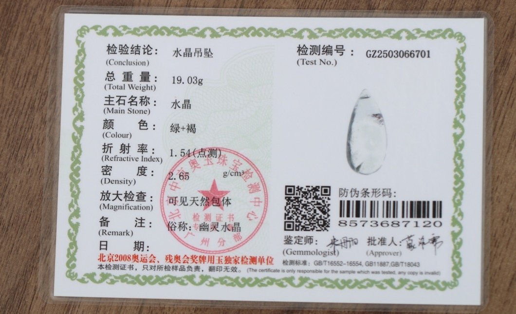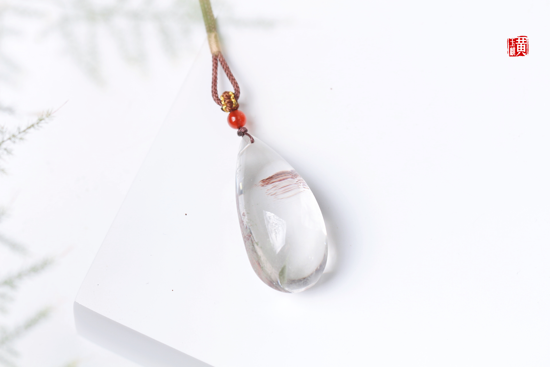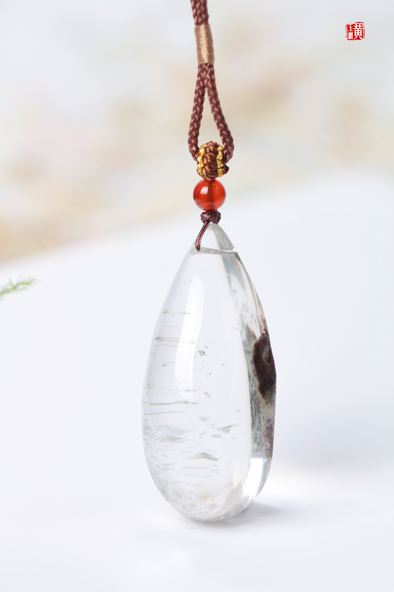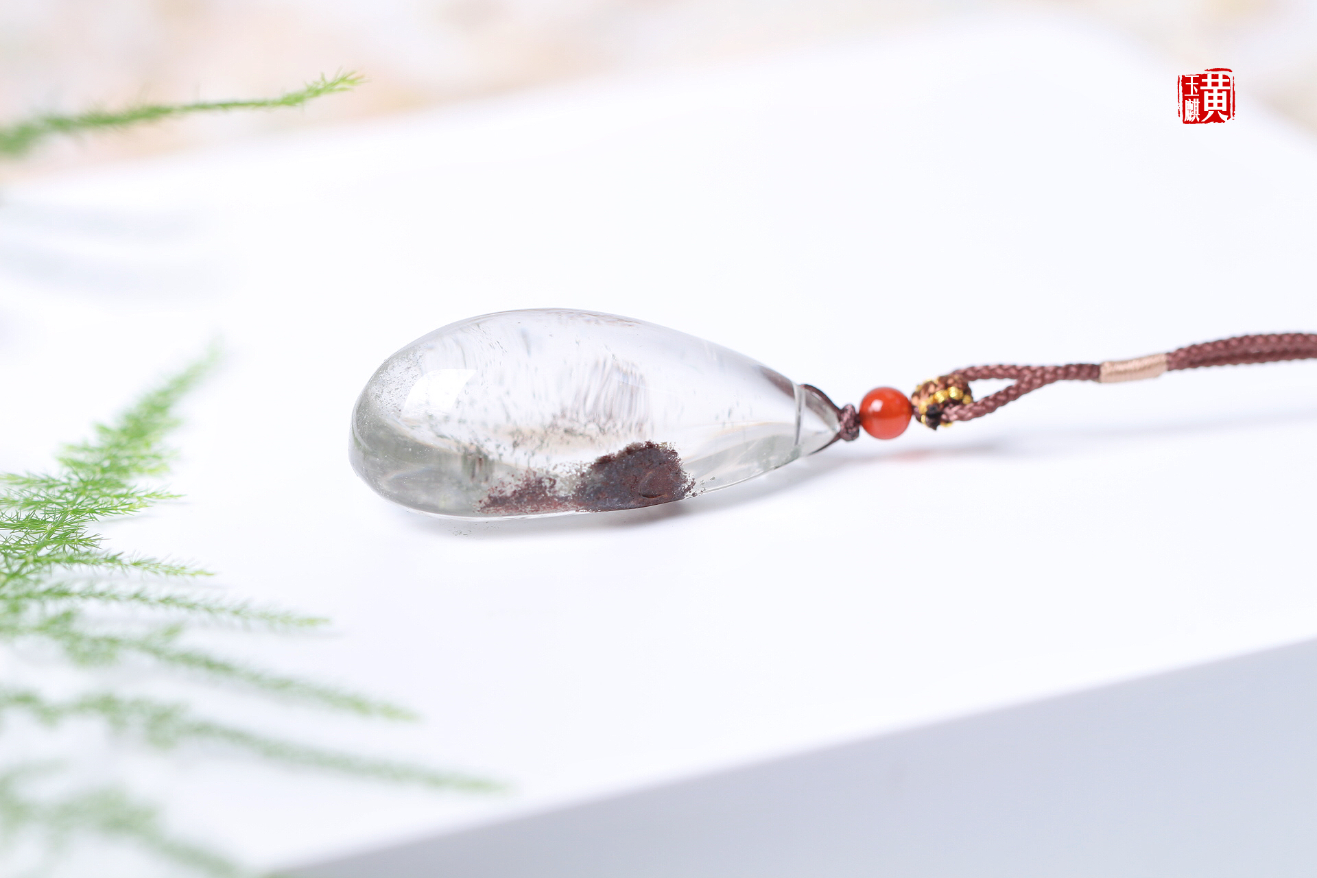 绿幽灵水晶吊坠,晶体通透明亮,宝瓶状,内含些许绿幽灵和红幽灵,灵动雅致,佩戴清清爽爽,寓意有财运兴旺、事业有成。