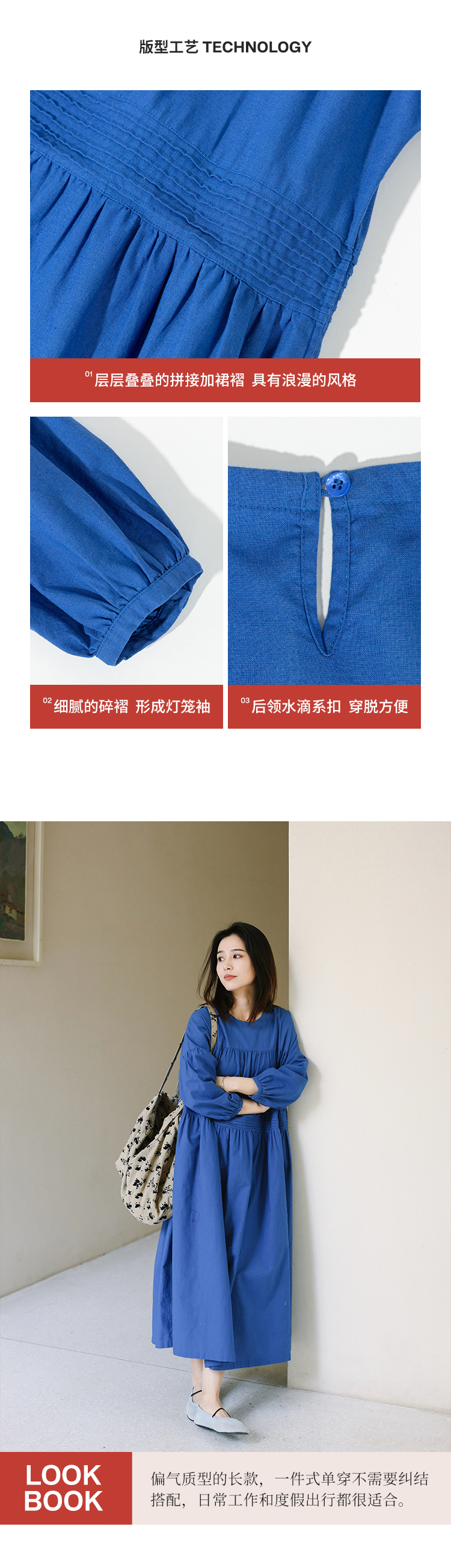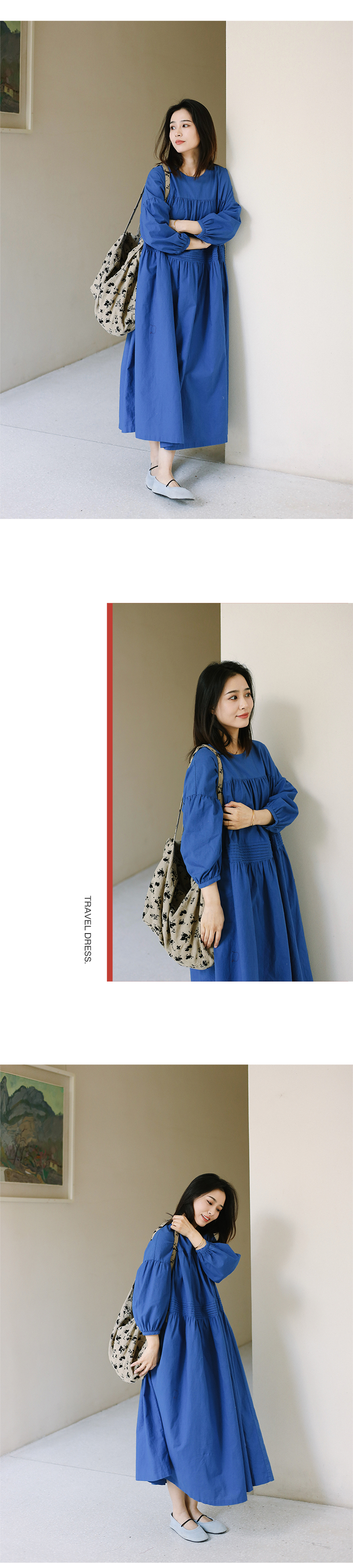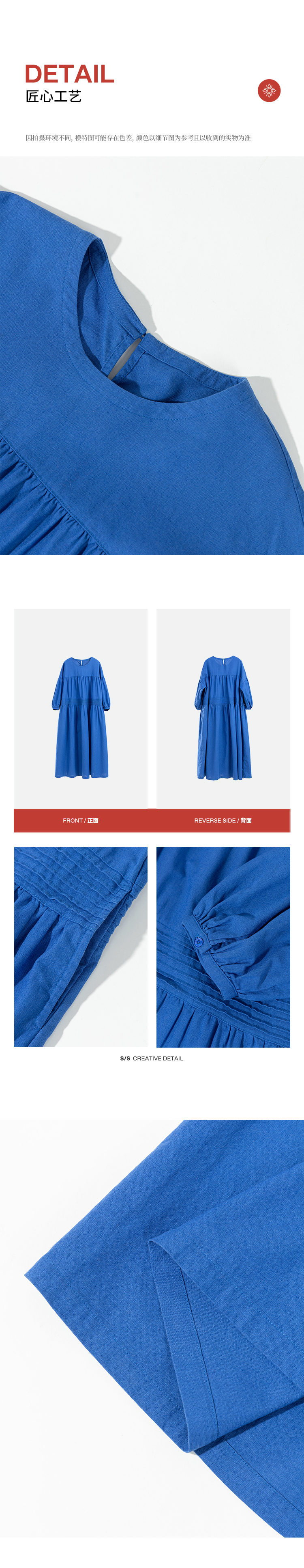绽放旅行女装113朵/亚麻棉圆领落肩长袖塔克捏褶宽松大摆连衣裙
