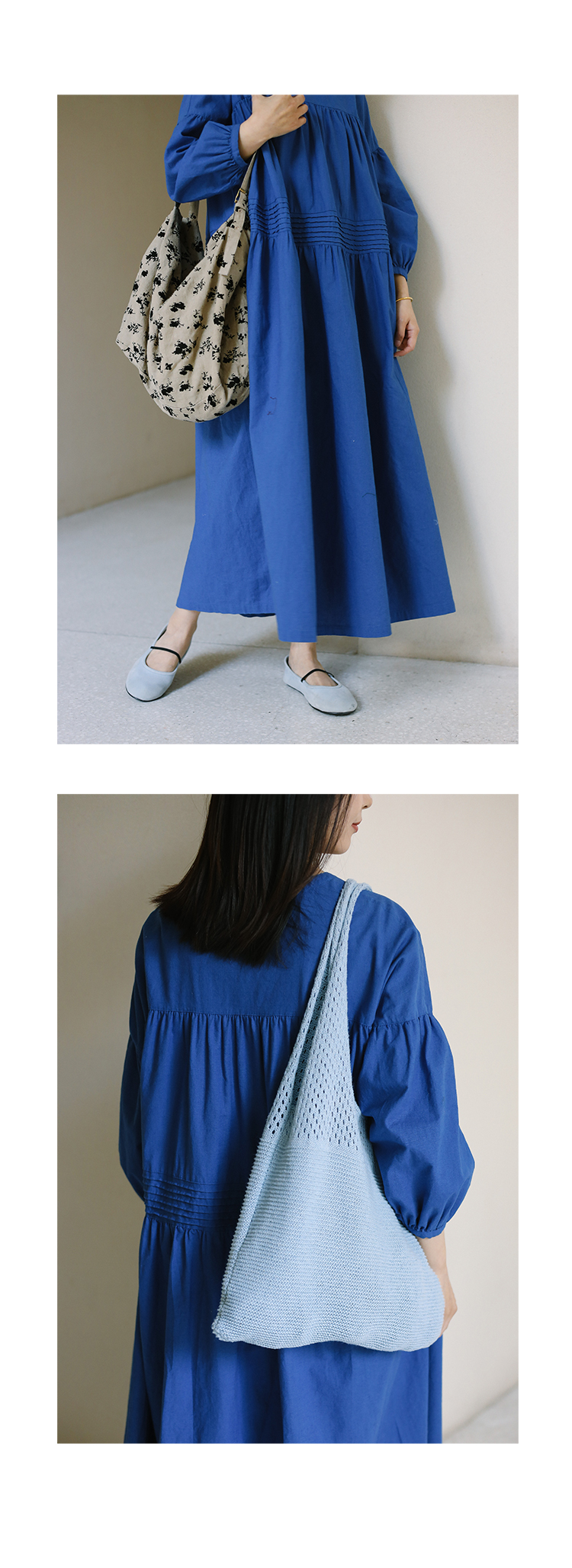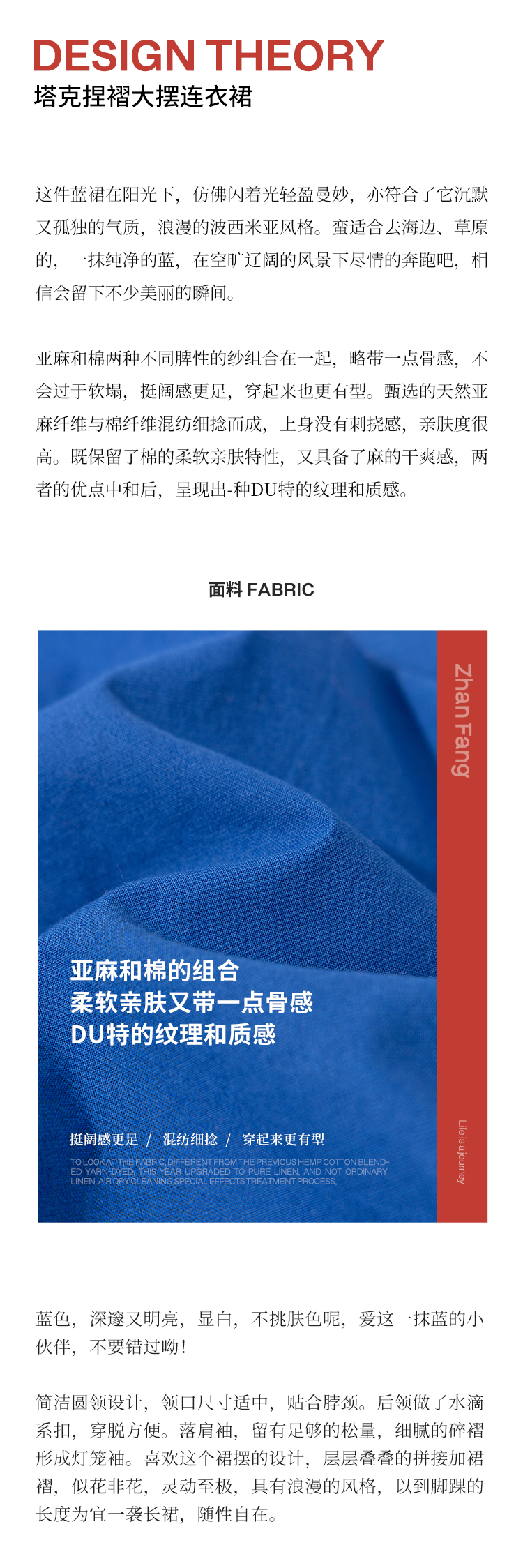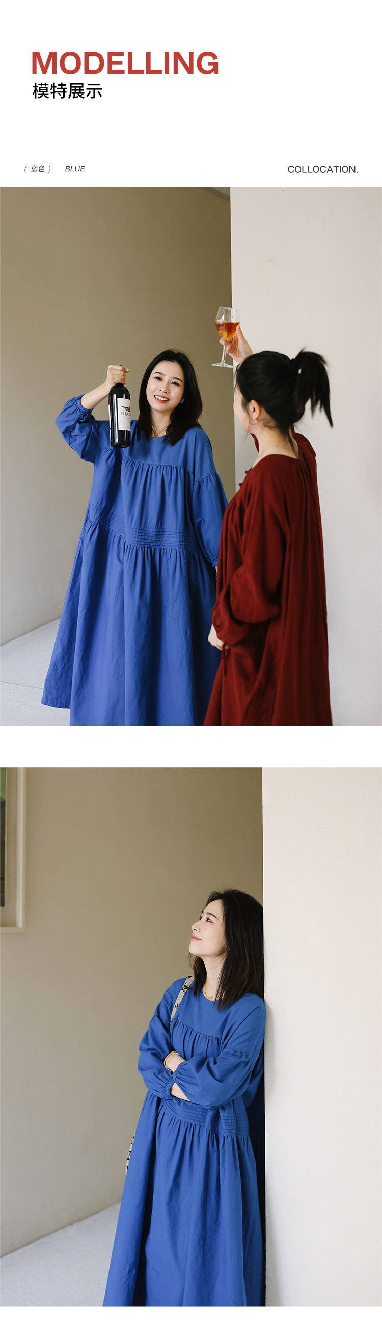 绽放旅行女装113朵/亚麻棉圆领落肩长袖塔克捏褶宽松大摆连衣裙