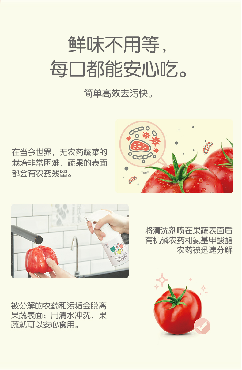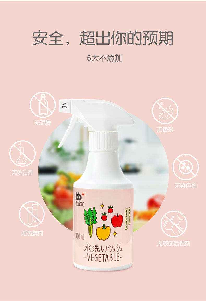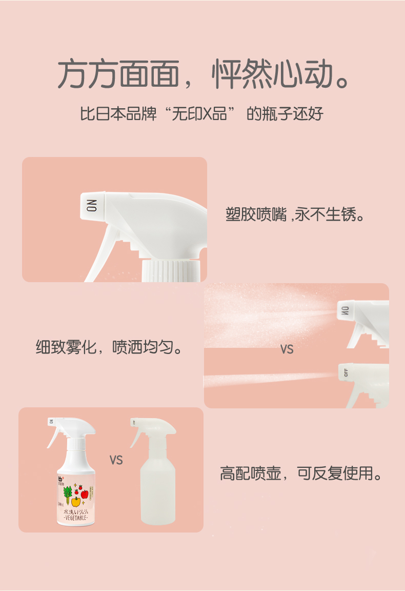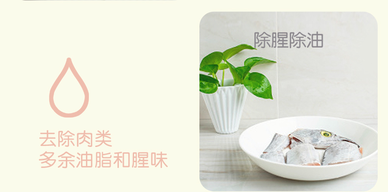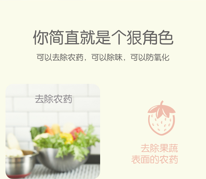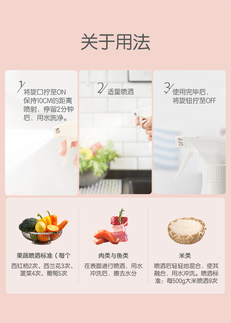 果蔬清洁剂:用于水果蔬菜,清除表面的农药,去除蔬菜的涩味,保持蔬菜以及水果的新鲜度;消除鱼/肉的腥味;清除大米表面附着的糠谷灰尘。