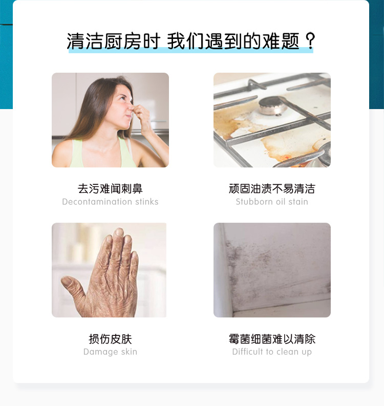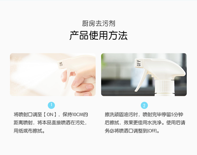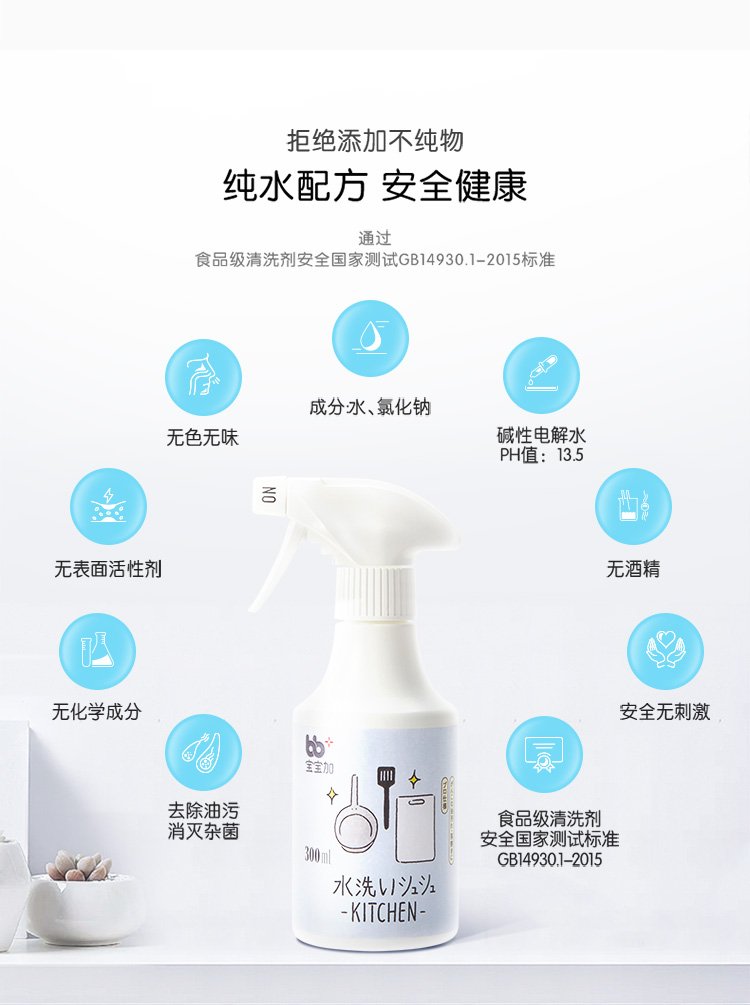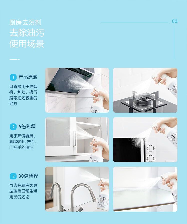 厨房清洁剂:可根据污浊的情况进行稀释使用,可清洁炉炊以及电磁炉的厨房周边、器皿、菜板菜刀等烹饪器具,桌子及架子较难清洁的生活用品。