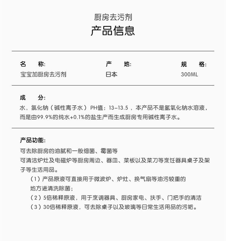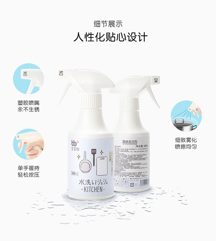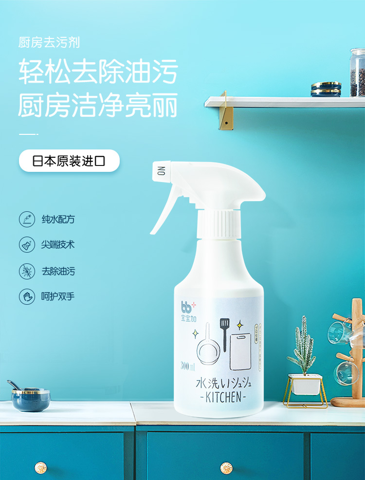 日本原装进口的宝宝加清洁剂,共有家具清洁剂、果酸清洁剂、厨房清洁剂三款。分别是弱酸、弱碱、强碱型,厨房清洁剂PH值最高,清洁力最强。