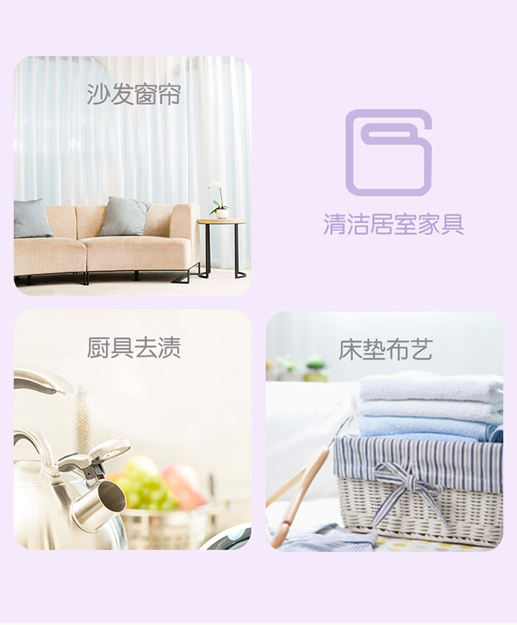 家具清洁剂:可用于地板、家具的清洁,去除卫生间、厨房生活垃圾的异味,去除水龙头、烧水壶的水垢、茶杯的茶垢,婴幼儿被子上的尿渍、猫砂盆除菌除异味。