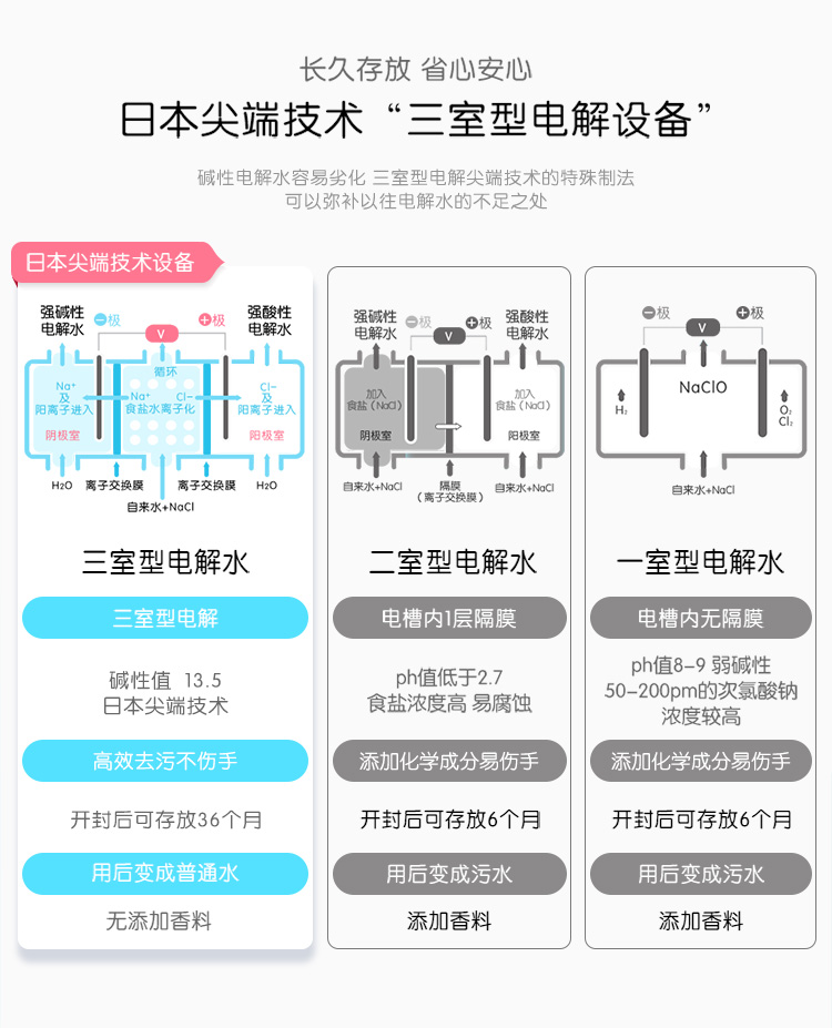 三款全部都是纯水清洗剂,成分是水和氯化钠,非常安全,只是正负离子数量不一样。