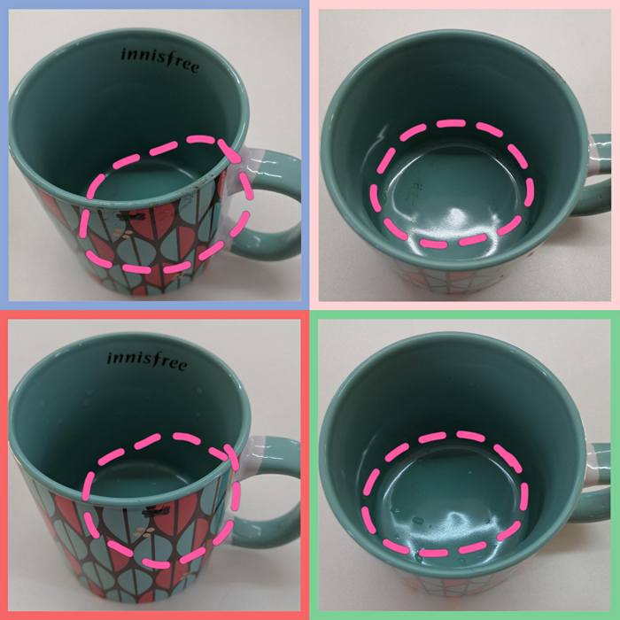 上图的杯口和杯底沾了胶水和圆珠笔水,怎么都擦不掉,用宝宝加的家具清洁剂喷洒后,静置2分钟后,用纸巾擦拭(用抹布可能更好擦,纸巾沾到液体会融化很快),图中对比图完全能擦干净。