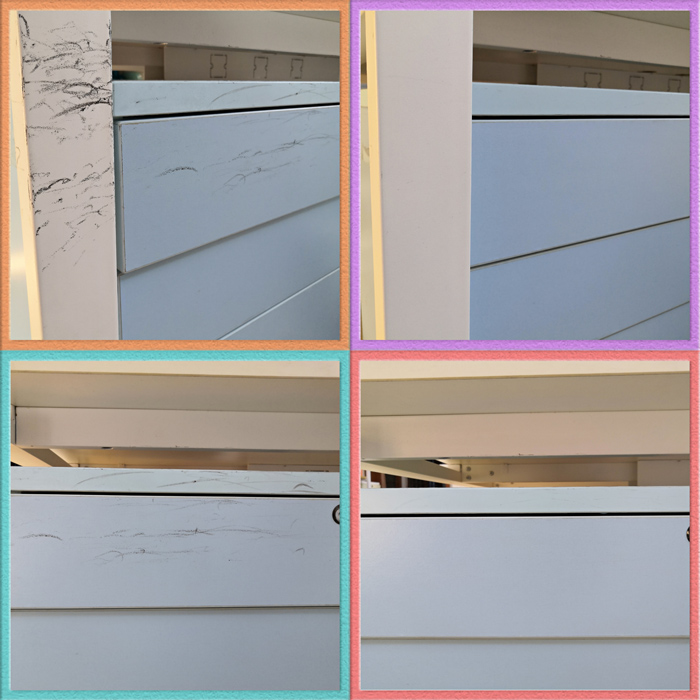 上图蓝色木质柜和白色金属桌角的黑色刮痕被办公椅扶手刮到,时间比较久,选用最强那款厨房清洁剂喷洒,静置5分钟后,用抹布擦拭,多次喷洒擦拭,完全能干净。