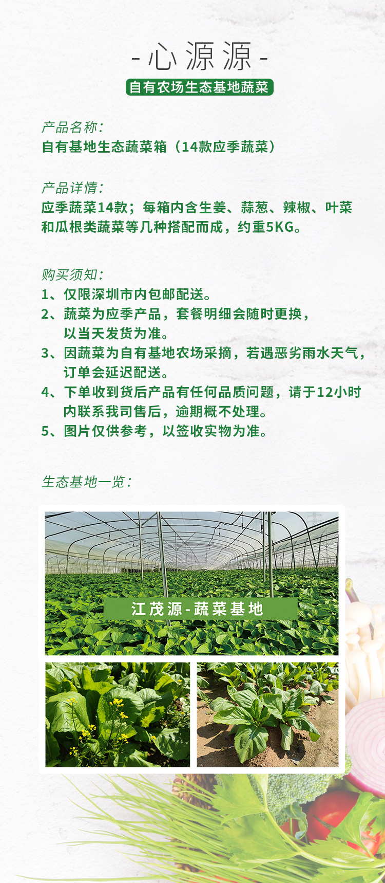 自有基地生态蔬菜箱(14款蔬菜)蔬菜箱内含应季14种蔬菜。每箱内含生姜、蒜、葱、辣椒、叶菜和瓜根类蔬菜等几种搭配而成)约重4.5kg
