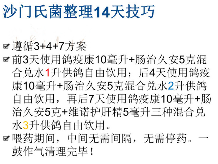 爆灯鸽药【沙门氏菌整理14天技巧】3+4+7方案