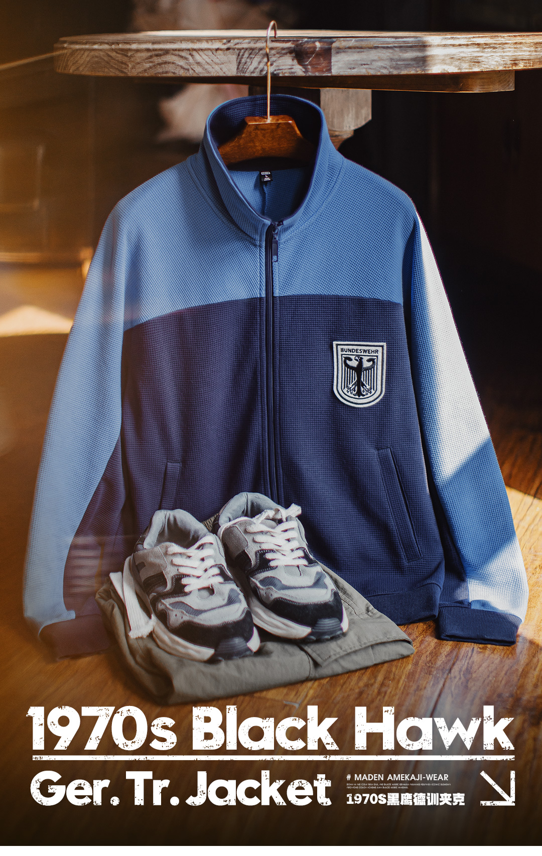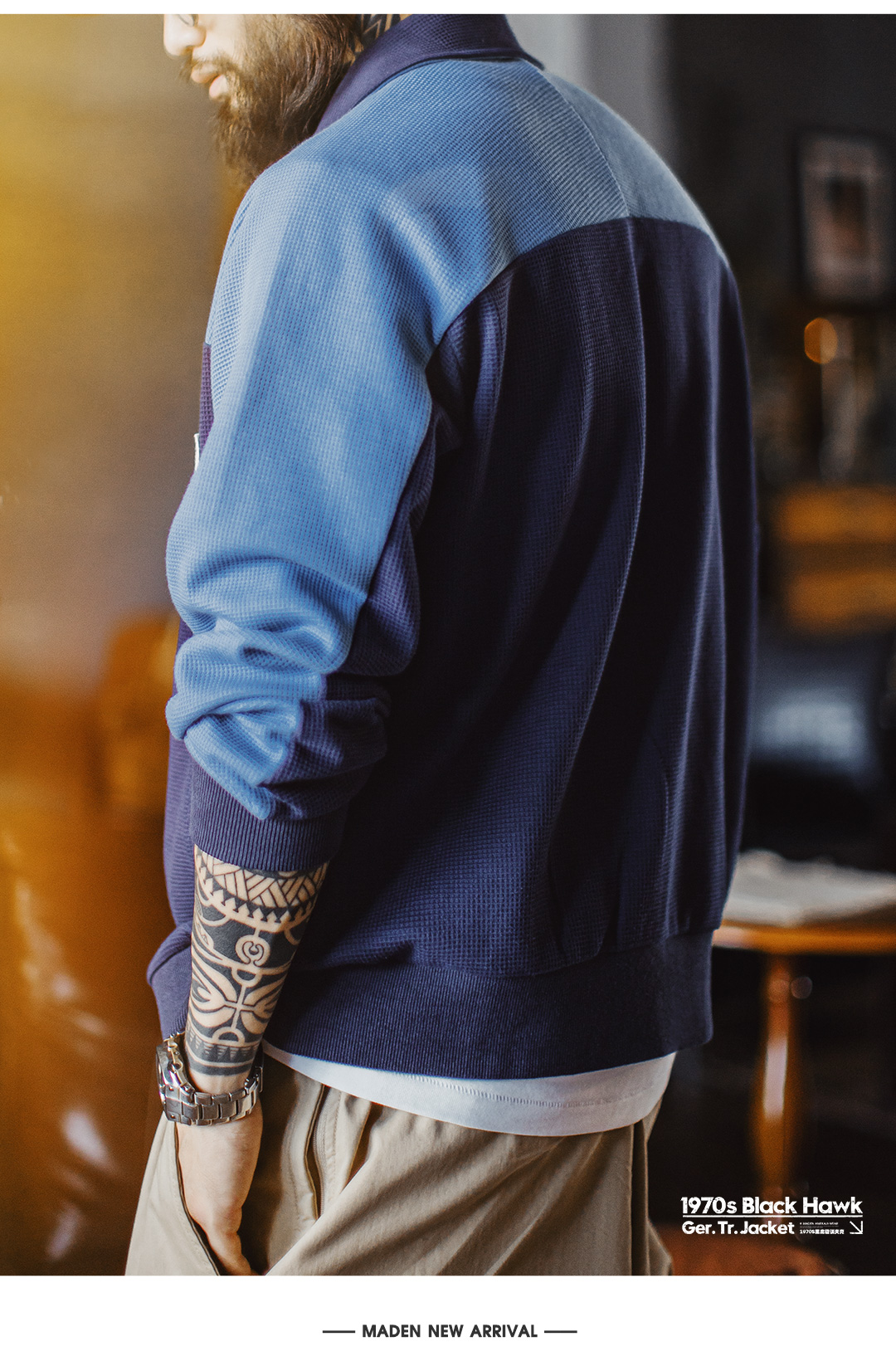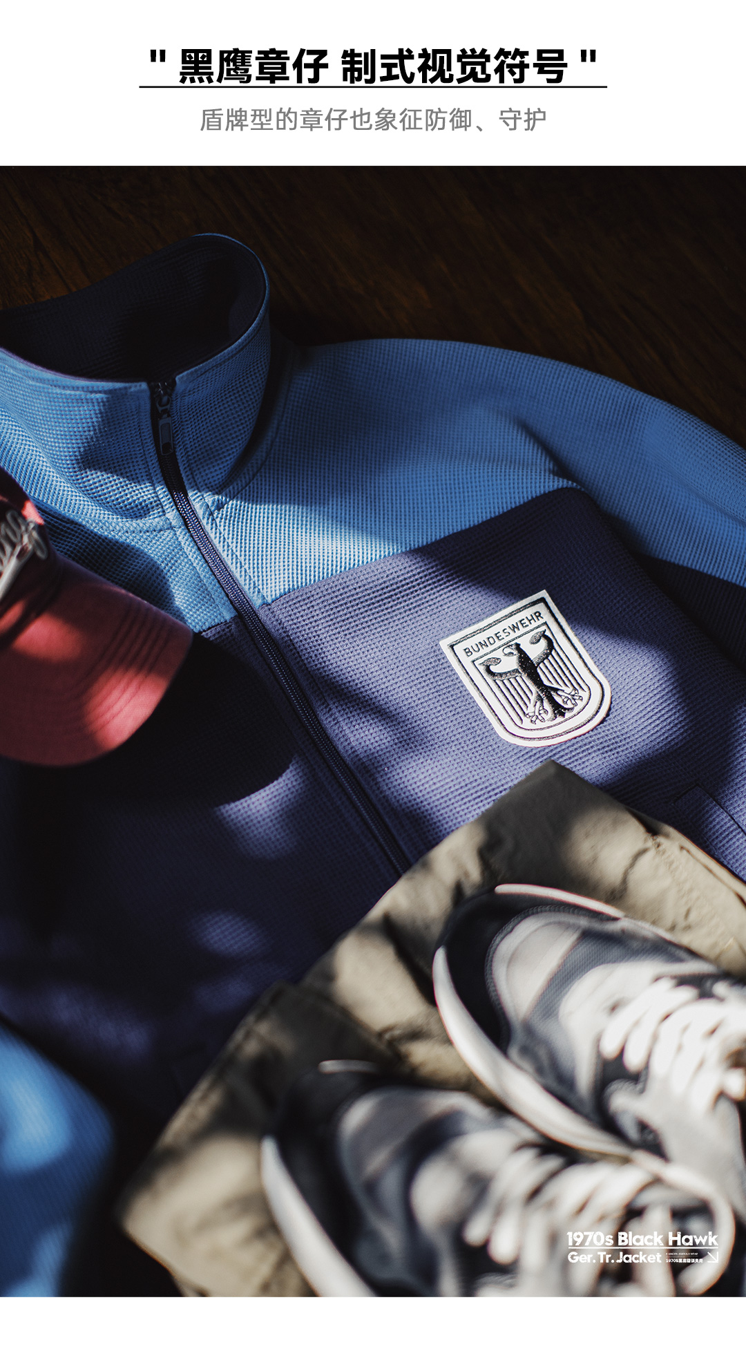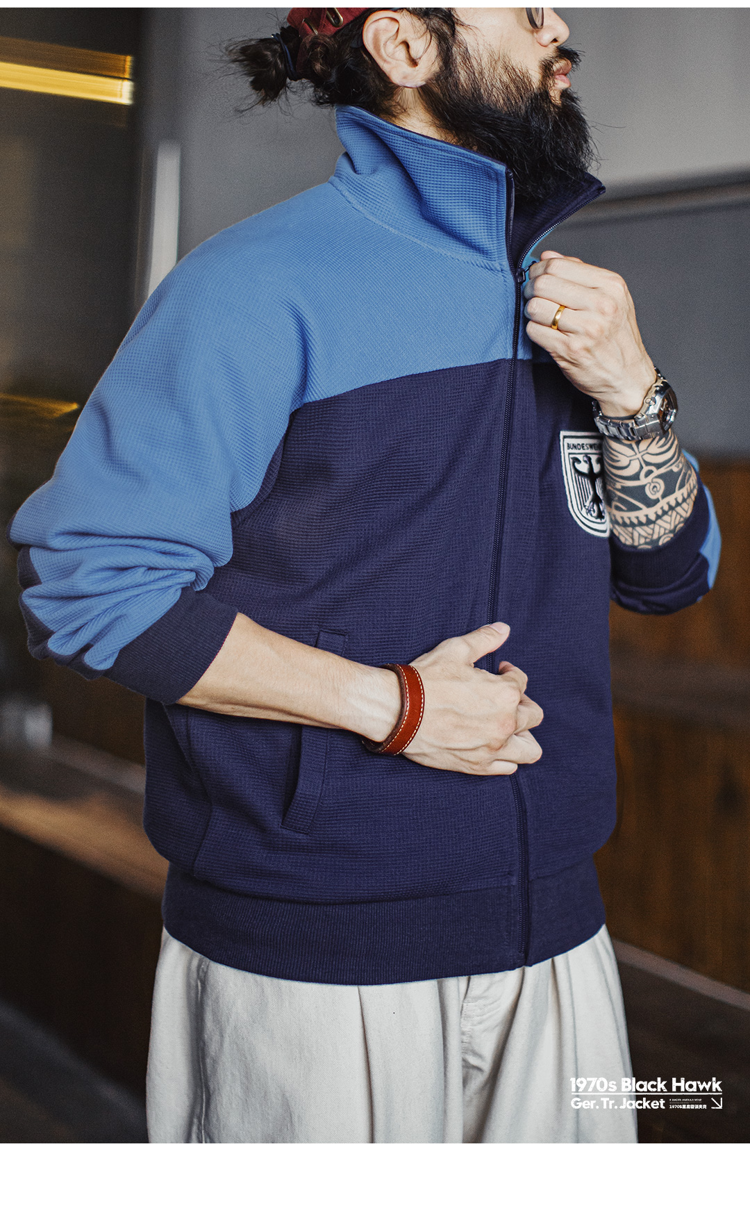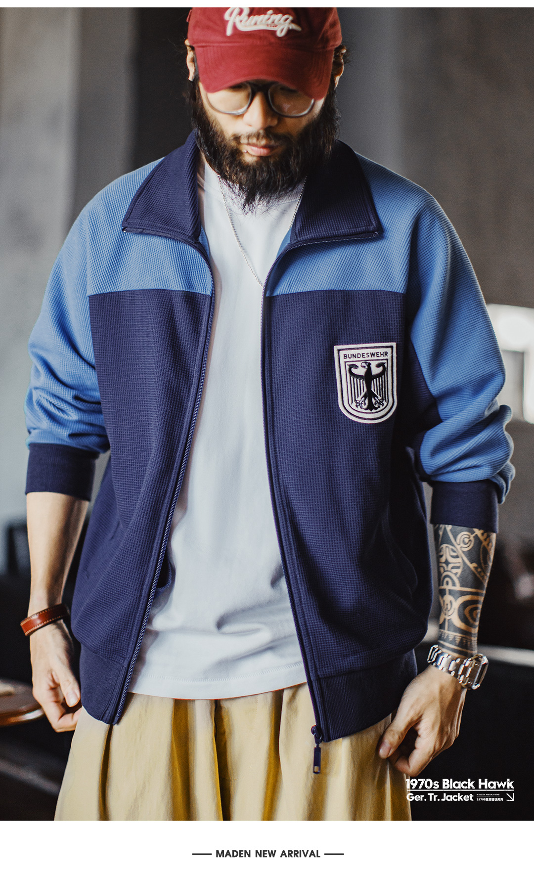 马登工装美式撞色教练夹克华夫格立领蓝色训练服透气长袖外套男秋