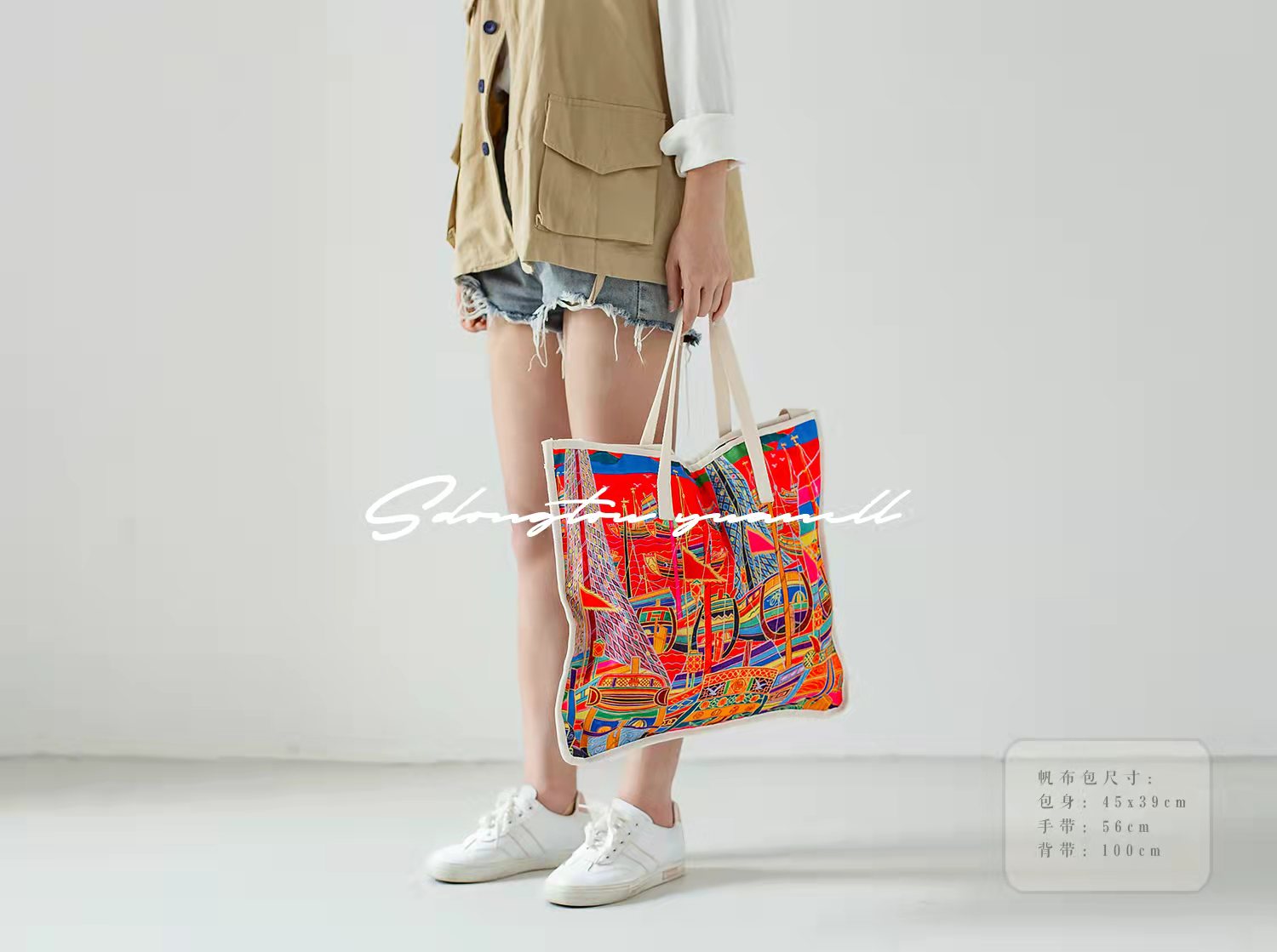 帆布包上的渔民画用现实主义的视角和浪漫主义的手法,将“靠海吃海”的洞头渔家生活展现得淋漓尽致。充分体现了海岛风情。
