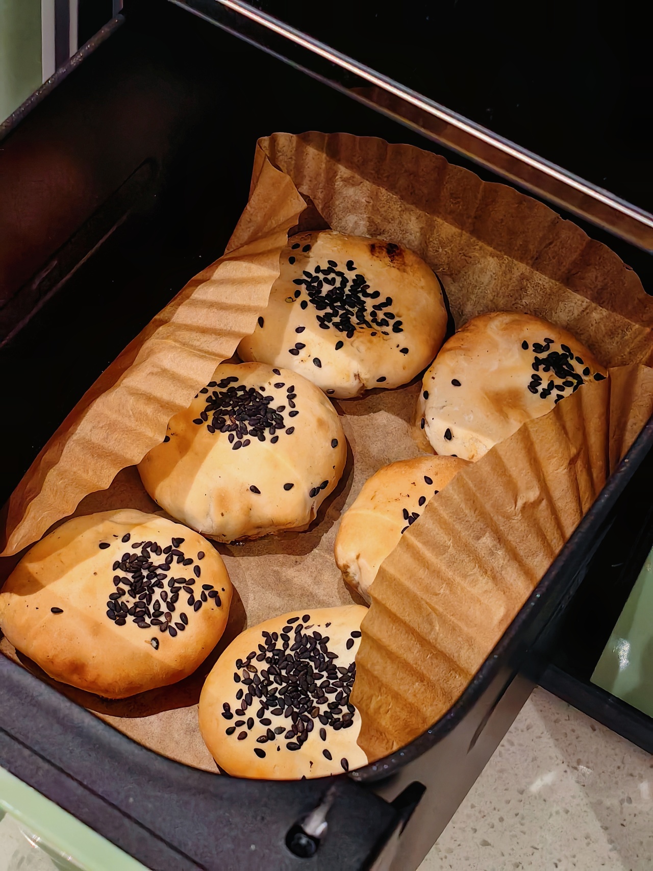 小鲜肉烧饼,有小葱鲜肉和梅干菜肉两个口味选择,每袋大概9个,收到后记得放冰箱冷冻哦!因为都是手工现包,大小不一,但都小巧可爱!想吃时,喷点油放入空气炸锅,两面各烤上10分钟,小肉饼就可以开吃了!饼皮经过短时间的烘烤,变得金黄酥脆,轻轻一咬,便能感受到层次分明的口感,既有小麦粉自带的淡淡甜味,又有着烘烤后特有的焦香,令人回味无穷!而包裹在内的肉馅,经过加热,肉质更加鲜嫩多汁,肥瘦相间的比例使得每一口都既有油脂的丰腴,又不失瘦肉的嚼劲,完美平衡了口感与味道!一丢丢提鲜的小葱,让小烧饼的味道更为精彩,而梅干菜口味,则是咸甜口,也是江浙一带的风味,很是经典!当然,除了用空气炸锅,还可以用微波炉、烤箱,自己用油煎煎就更好啦,几分钟就可以吃上美味的烧饼子!