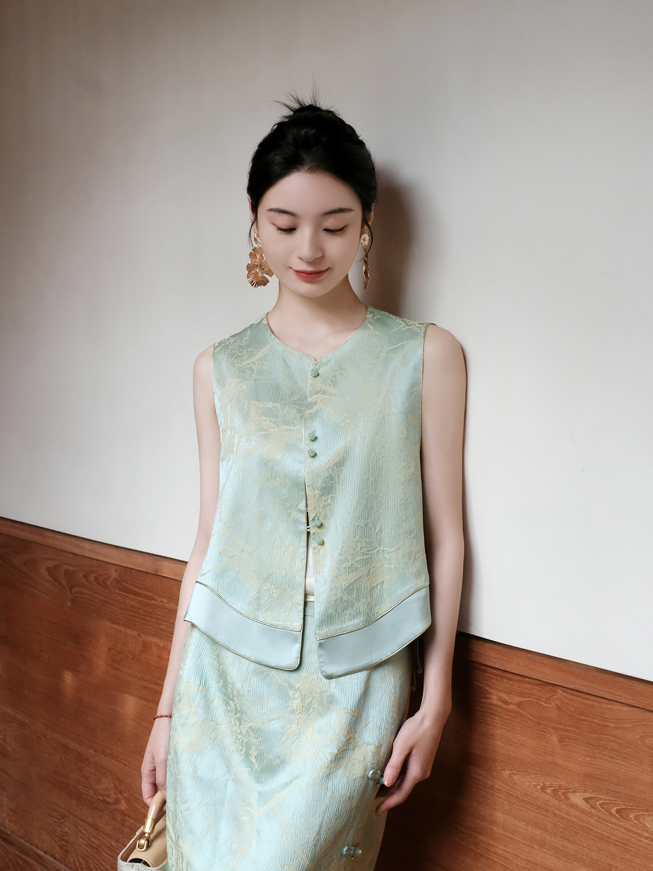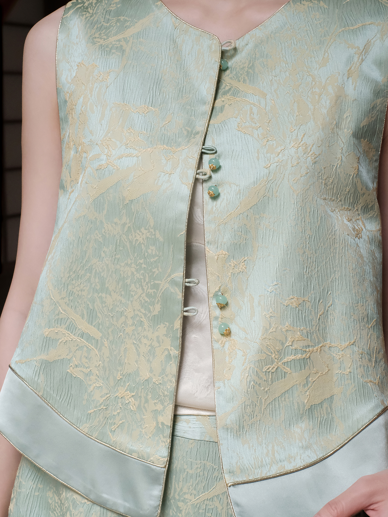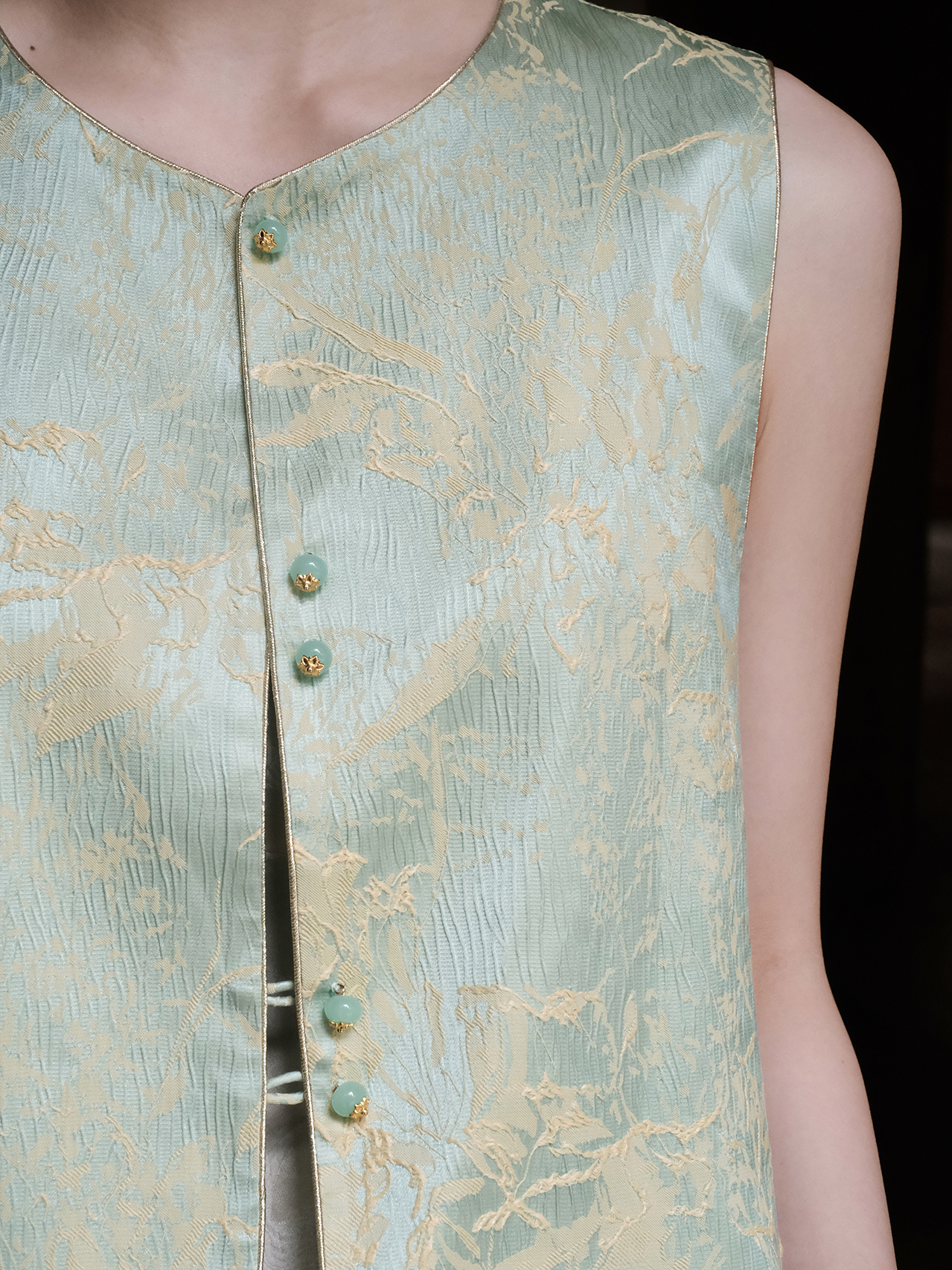盛唐婧| 新中式真丝双色冠乐皱对襟马甲-绿色