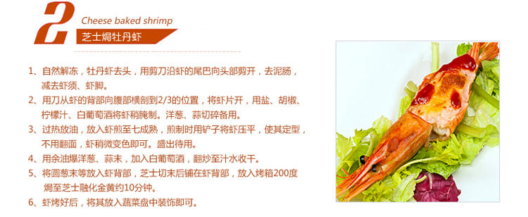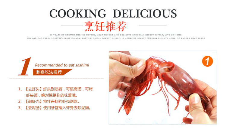 除了生食,牡丹虾还可白灼、清蒸、油爆、碳烤、火锅或芝士煎焗等。虾头中的虾膏甘甜味浓,可用来烧烤、入汤,煲粥,有一道虾头焗饭,是把虾头里攘上米饭,稍调味,虾膏和米饭充分融合,味道奇美。
