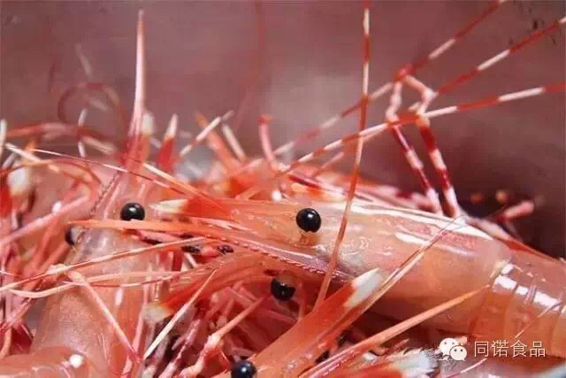 加拿大的牡丹虾的头部则是有横向的条纹,虾身近头部和尾部有2对非常明显的白色斑点,即使去壳后虾肉上仍然清晰可见,另外虾须也是红白相间的。如下图: