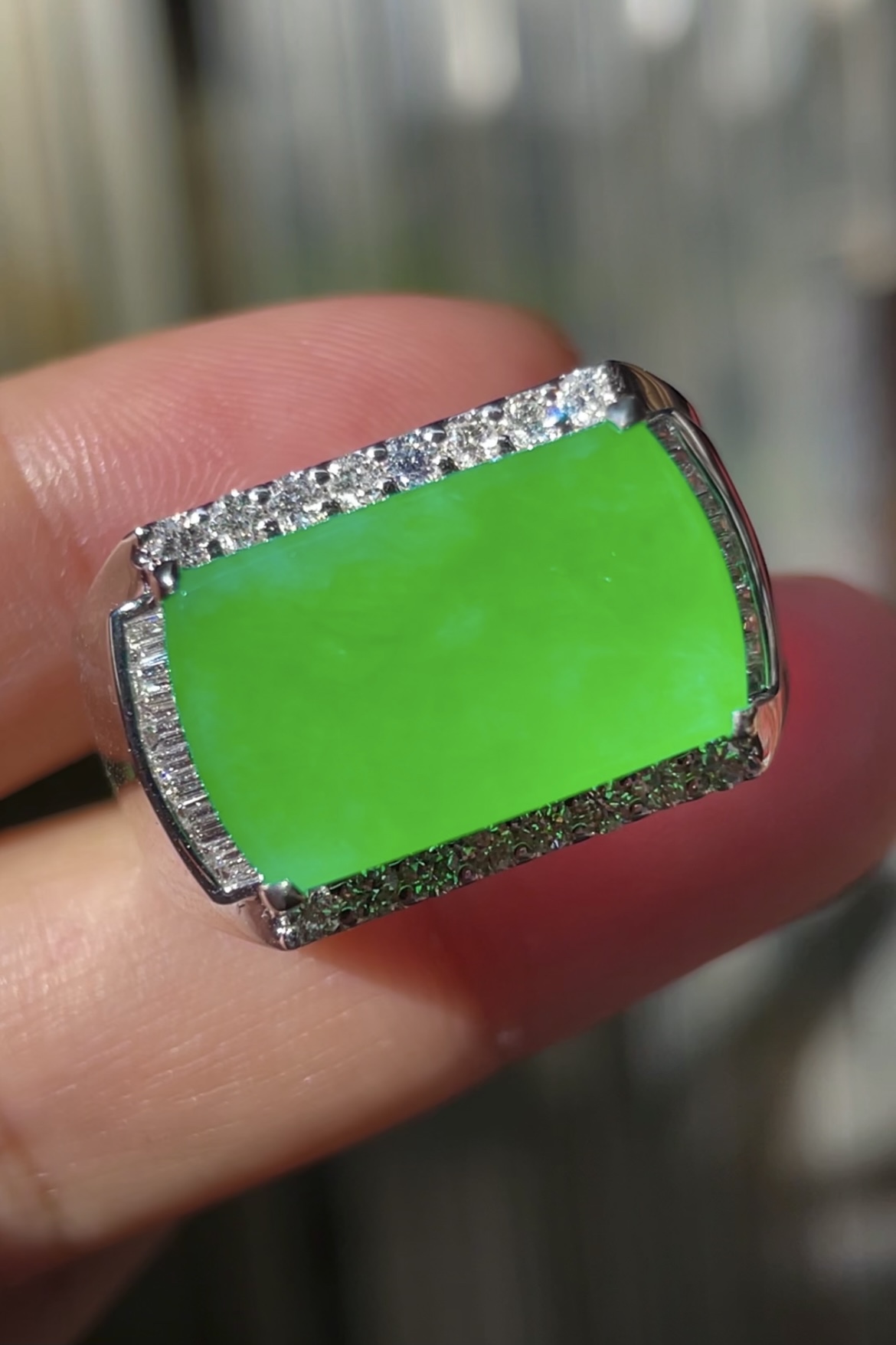 大件饱满,通透水润,玉质细腻,翠色鲜艳,18k金奢华钻石镶嵌