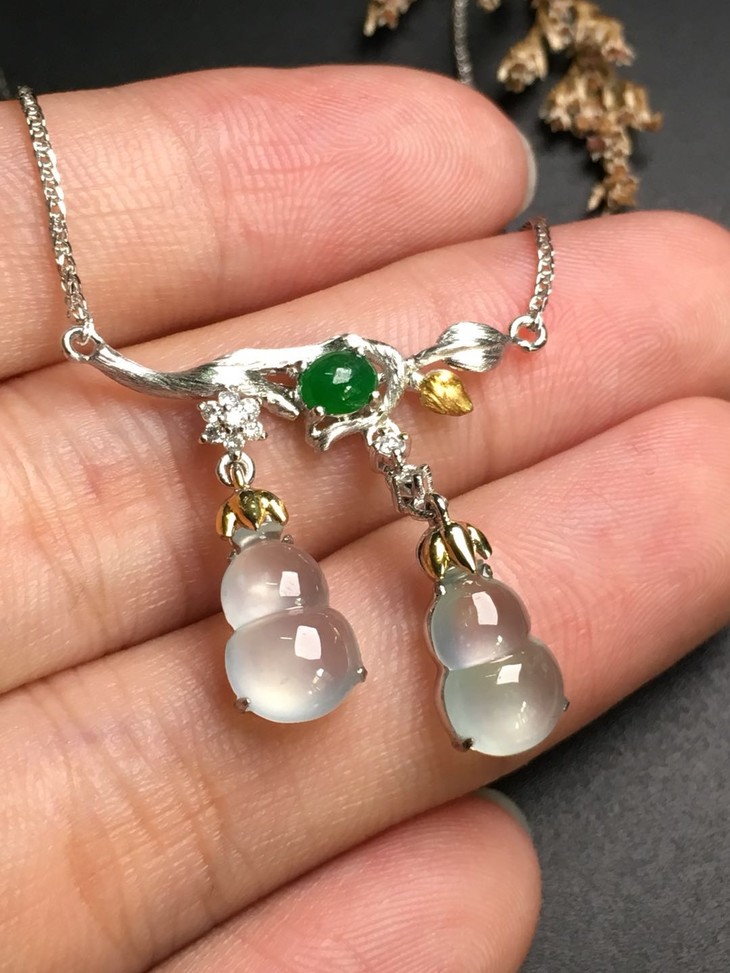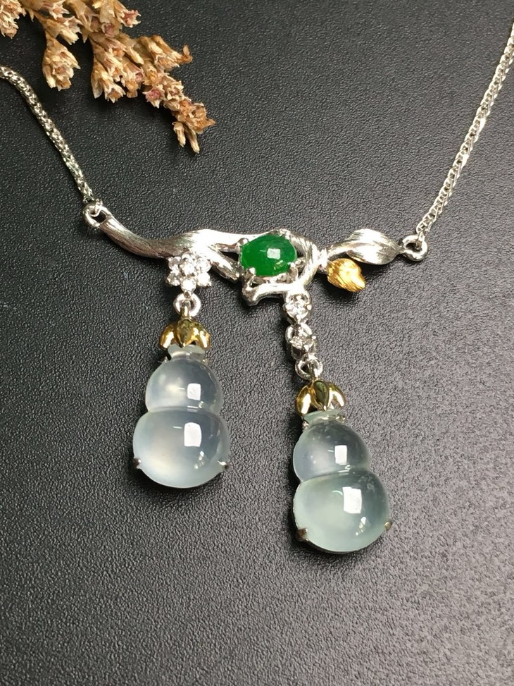 【12410】翡翠高冰双葫芦吊坠,种水十足,水润光泽,饱满细腻,荧光起胶,18K镶嵌,款式精美,葫芦谐音福禄,寓意着福禄常伴,多子多福。裸石尺寸:10.3*7*3.6mm。结缘价4000