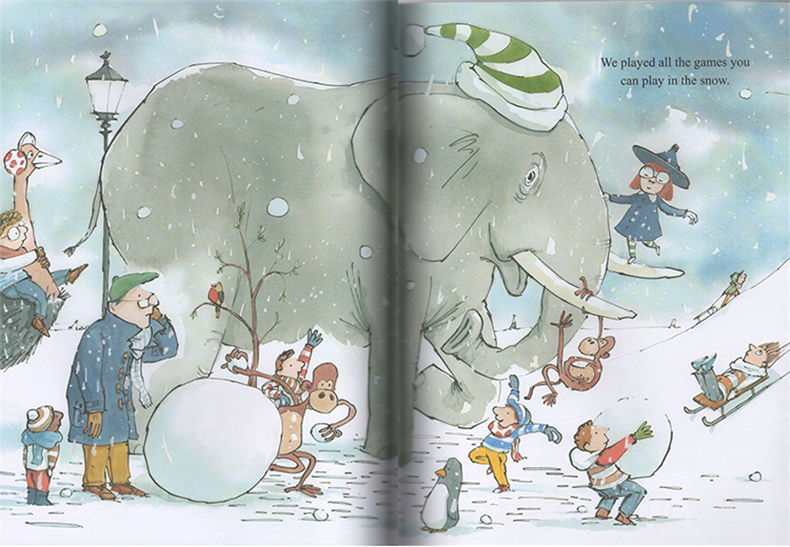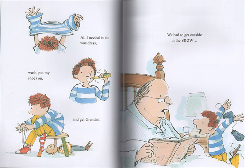 雪总是拥有神奇的能力,让成人找回久违的童真,让孩子插上想象的翅膀。山姆·亚瑟用钢笔和水彩描绘出了祖孙两人在一个雪天的小故事,凸显了两代人的年龄、性情差异——外孙迫不及待要冲到雪地里去,但仍旧克制着鲁莽和冲动,一直在门口等待;外公慢条斯理、有条不紊,但又总是提醒外孙穿戴齐整,满是对晚辈的关心。祖孙间看似不经意地对话,打开了想象的大门,家里的布偶玩具变成了随后陪他们一起在雪地玩耍的动物。书中充满雪天童趣和祖孙亲情,同时告诉我们美好的事物总经得起耐心等待。