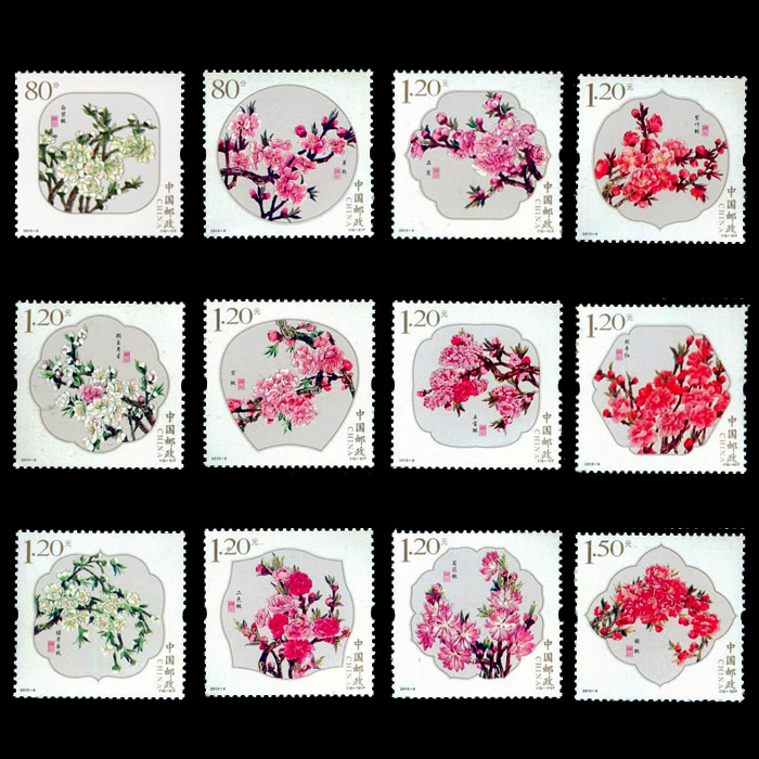 中国邮政于2013年3月16日发行《桃花》特种邮票1套12枚。原胶全品!